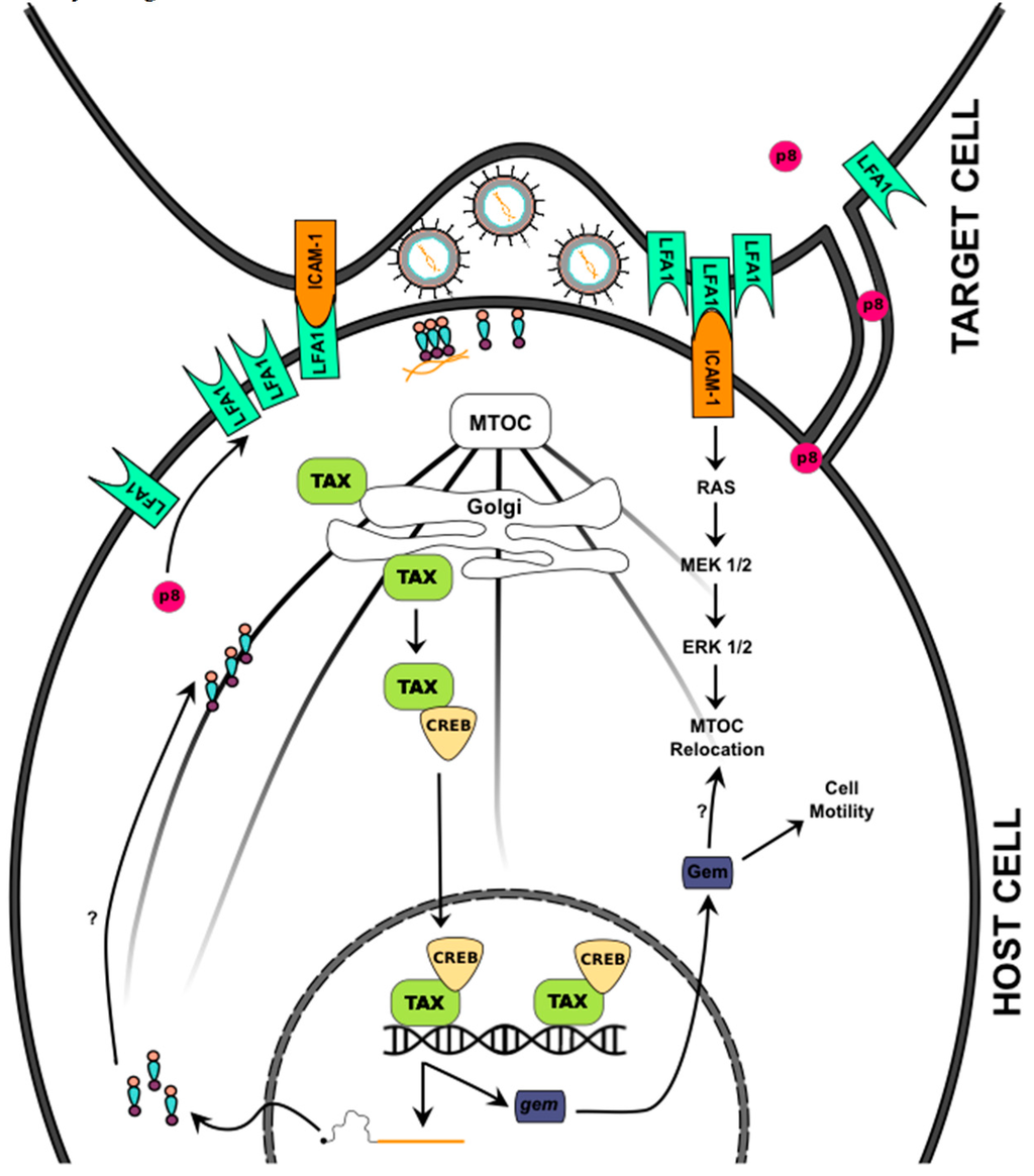 HTLV-1 Cell-to-Cell Transmission. Shown in the diagram is a host cell (bottom) that has anchored itself to a permissive target cell (top) using ICAM-1 and LFA1. The HTLV-1 accessory protein p8 has been shown to increase the expression of the LFA1 receptors as well as increase the number of cell-cell synapses, which p8 then traffics through to increase LFA1 in the target cell. Once ICAM-1 is bound, it triggers a signaling cascade that leads to the relocation of the MTOC. Additionally, HTLV-1 Tax is found bound to Golgi bodies that are attached to the MTOC. This initiates a variety of cell signaling cascades. For example, one established pathway increases expression of Gem, a protein that increases cell motility and possibly MTOC relocation. As HTLV-1 Gag is produced, it is found concentrated at the MTOC. Subsequently, HTLV-1 Gag is found at the sites of cell-cell contacts where the virus particles bud into the viral synapse formed by the cellular adhesion points. Virus particles produced can bind receptors for entry into the permissive target cell. The question marks along the lines with arrows indicate mechanisms of transport or activation that are not well understood.