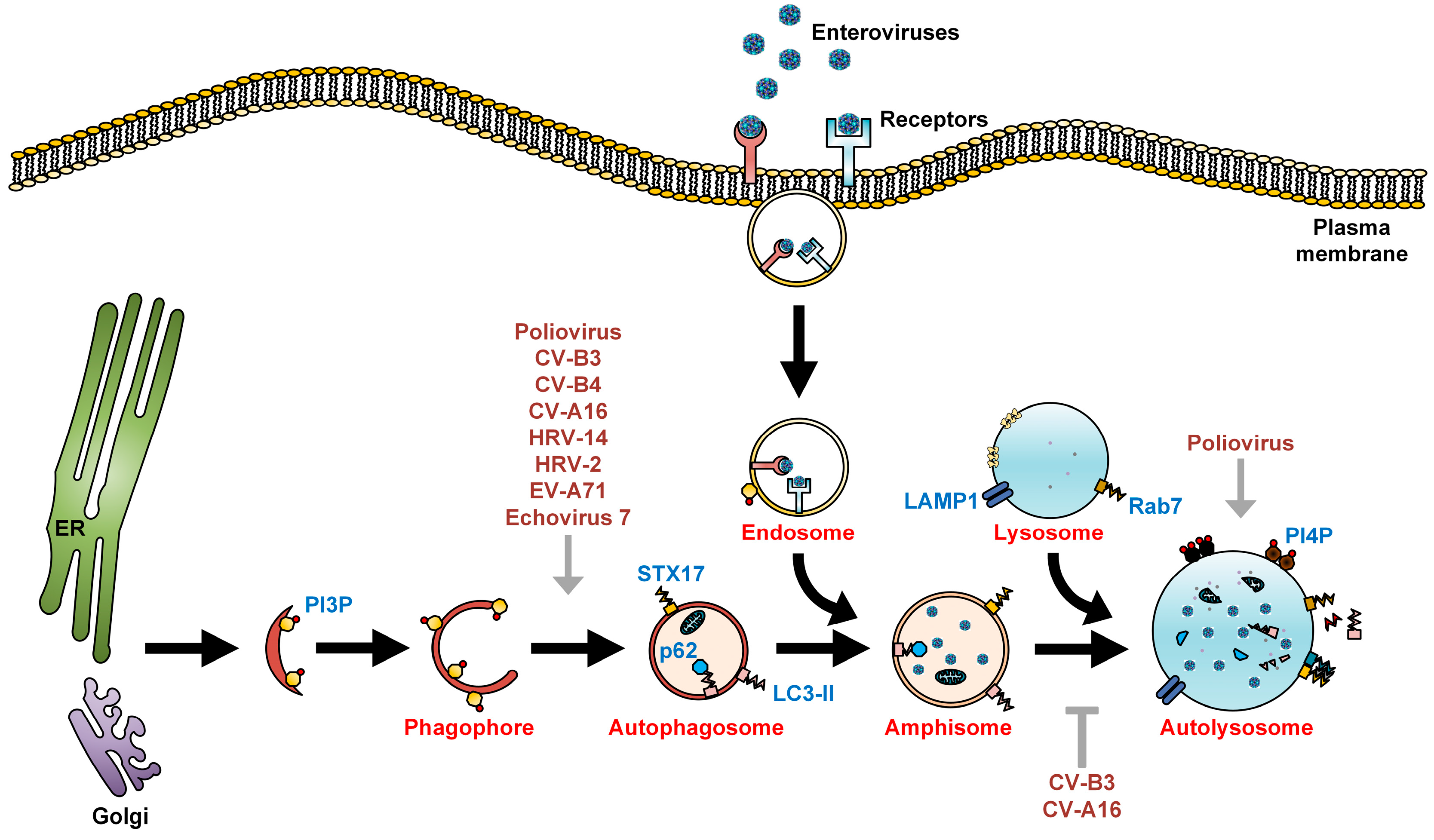 It is of interest to determine if autophagic degradation of specific targets, including lipophagy (lipids), glycophagy (glycogens), mitophagy (mitochondria), pexophagy (peroxisomes), aggrephagy (protein aggregates), and ER-phagy (endoplasmic reticulum) are exploited by enteroviruses to facilitate their infections [70]. Additionally, the recent identification of specific regulators of autophagosome maturation, including STX17-SNAP29-VAMP8 and LC3-II-PLEKHM1-Rab7 complexes, may enable deeper understanding of mechanisms and roles of autophagy in enteroviral pathogenesis. The non-lytic spread of picornaviruses via exosomes was initially shown during hepatitis A infection, allowing hepatitis A virus to escape from neutralizing antibodies [71]. More recently, enteroviruses were discovered to transmit non-lytically via autophagosome-like vesicles, as populations of viral particles enwrapped in membranes of microvesicles [15]. Vesicular transmission could be beneficial for the overall fitness of enteroviruses, by allowing viral quasispecies to infect susceptible cells [72]. It could provide further insights into different tissue tropism of enteroviruses.