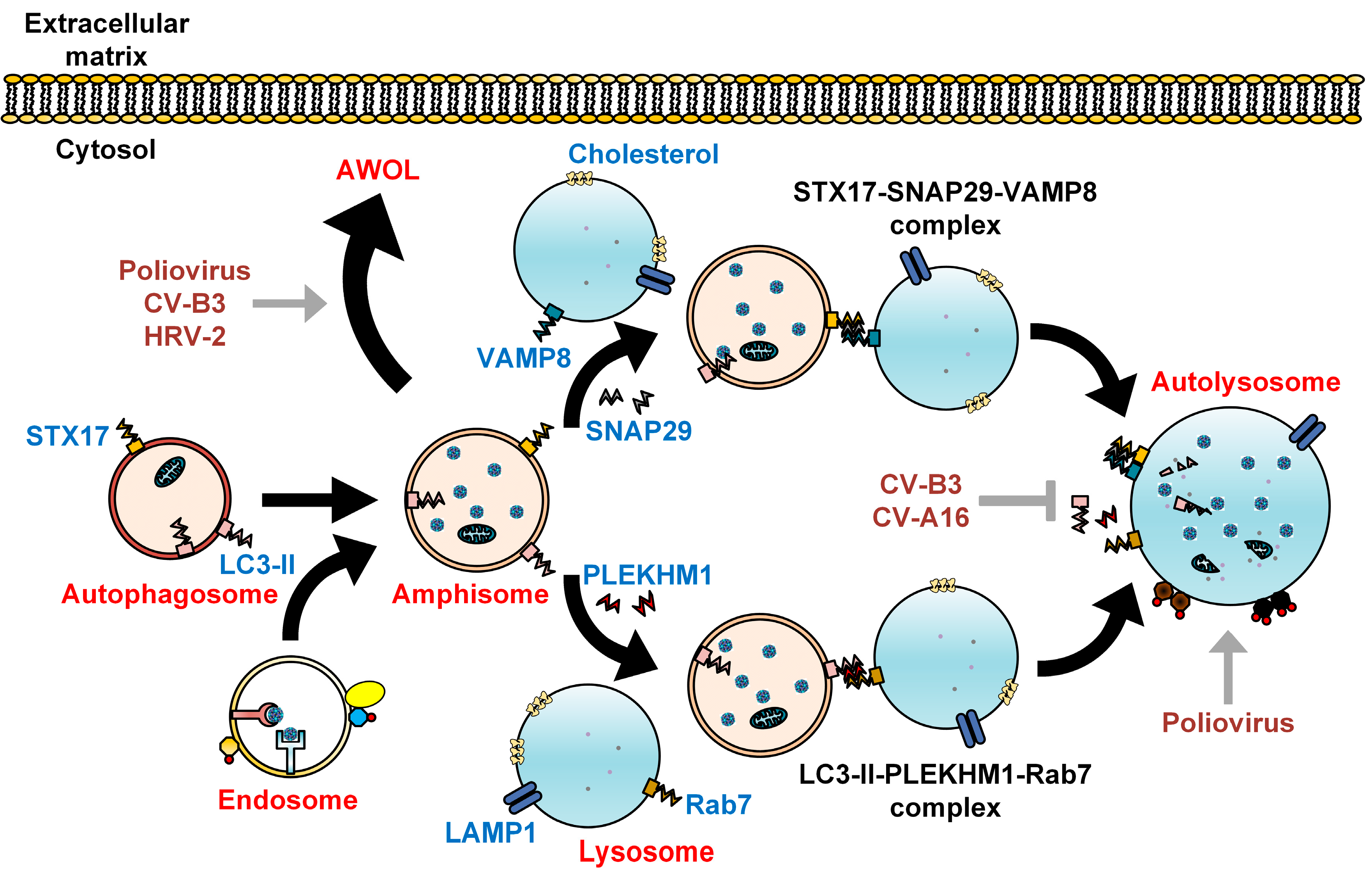 Subversion of autophagosome maturation by enteroviruses. As recently described, autophagosomes fuse with lysosomes via the SNARE complex consisting of STX17, SNAP29, and VAMP8. Alternatively, autophagosome-lysosome fusion can be achieved via LC3-II, PLEKHM1, and Rab7. The engulfed cytoplasmic organelles are then degraded along with the inner membrane of the autolysosome, in a process termed autophagic flux. Cholesterol is commonly found on the membranes of autolysosome. Fusion between autophagosomes and endosomes forms amphisomes bearing viral particles, which can fuse with the plasma membrane to secrete enteroviruses via a proposed process known as autophagosome-mediated exit without lysis (AWOL). Enteroviruses positively (grey arrows) and negatively (grey T arrow) regulate autophagosome maturation to facilitate their own assembly, maturation, and exit from the host.