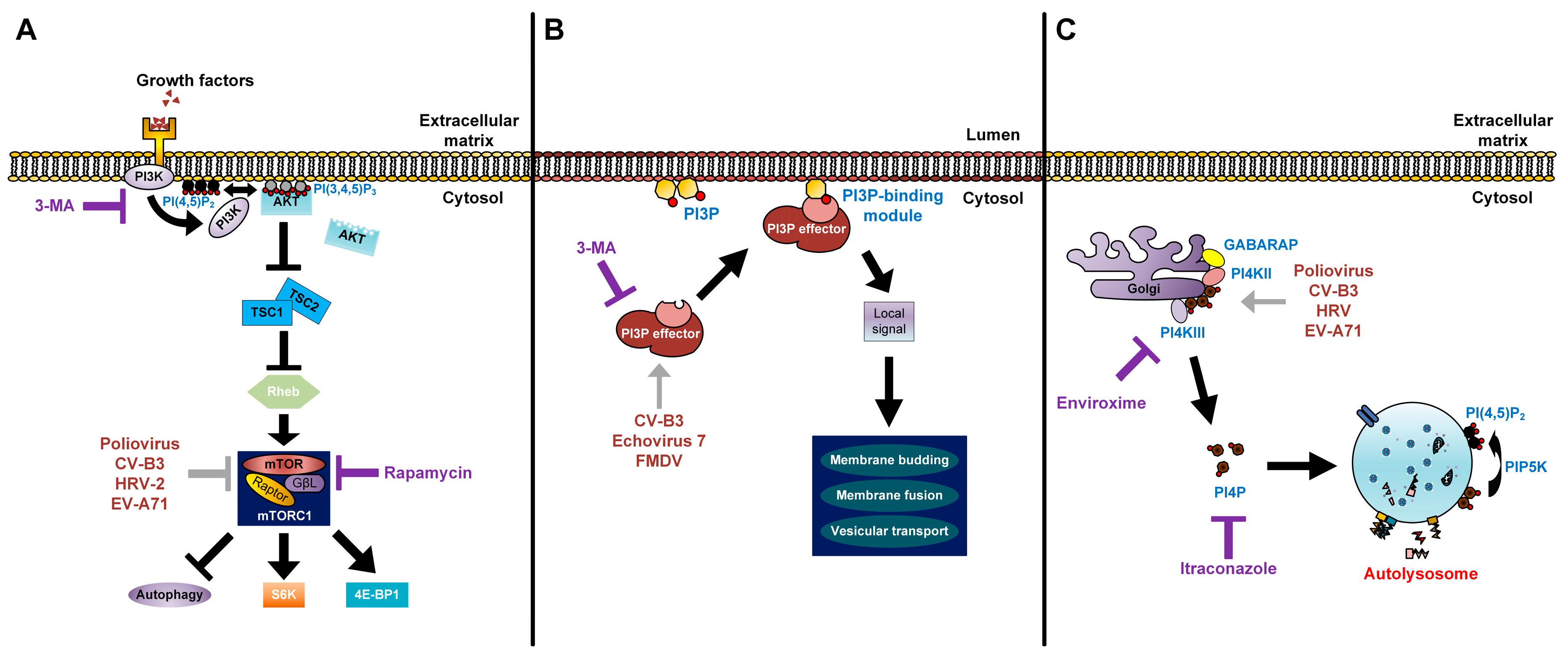 Modes of action of lipids in enterovirus replication. (A) The processes of lipid signal transduction regulated by enteroviruses. Class I PI3Ks and their downstream product PI(3,4,5)P3 regulate mTORC1 signals. The phosphorylation of PI(4,5)P2 via PI3K activates the AKT signaling pathway. AKT blocks the inhibitory effect of TSC1-TSC2 complex on Rheb. Activated Rheb in turn promotes mTORC1 complex signaling. Rapamycin inhibits the mTORC1 complex (violet T arrow) and further enhances production of enteroviruses, which also have an inhibitory effect on mTORC1 (grey T arrow). 3-MA inhibits the class I PI3K and shuts off its downstream signaling (violet T arrow); (B) Picornaviruses recruit PI3P effectors (grey arrow) to the outer membranes of autophagosomes. PI3P lipids on autophagosome membranes directly interact with PI3P effectors to induce signals for membrane budding, membrane fusion, and vesicular transport of autophagosomes; 3-MA inhibits the recruitment of PI3P effectors to PI3P lipids (violet T arrow); (C) Enteroviruses recruit PI4KIIIβ (grey arrow) via Golgi-localized host factors, resulting in an increase of PI4P lipids. These lipids are commonly found to localize on autolysosome membranes and are converted to PI(4,5)P2 by PIP5K for autophagic lysosome reformation. Enviroxime inhibits PI4KIIIβ and itraconazole inhibits cholesterol and PI4P transfers (violet T arrow).