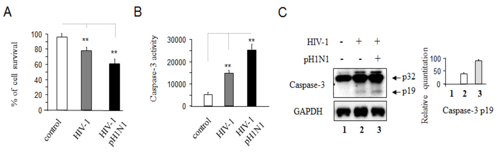 It was reported that Influenza virus infection could cause severe complications in HIV-1-infected individuals leading to an increased risk of complications and death compared with uninfected individuals [,]. We found that pH1N1 could infect and replicate in Jurkat cells and primary CD4+ T cells (Figure S2). To examine whether pH1N1 infection increased cell death due to HIV-1 infection, Jurkat cells were infected with HIV-1 for three days, followed by incubation in the presence of pH1N1 for another three days. As shown in Figure 1A, pH1N1 infection caused increased cell death in HIV-1 infected cells compared with uninfected cells (control). We also tested caspase-3 activities (Figure 1B,C) and found that more caspase-3 was activated by pH1N1 in HIV-1 infected cells than uninfected cells (control). We also obtained the similar results with using primary CD4 T cells incubated with HIV-1 for seven days and then infected with pH1N1 for another three days (Figure S3A,B).