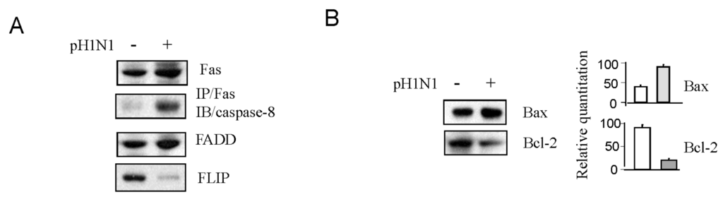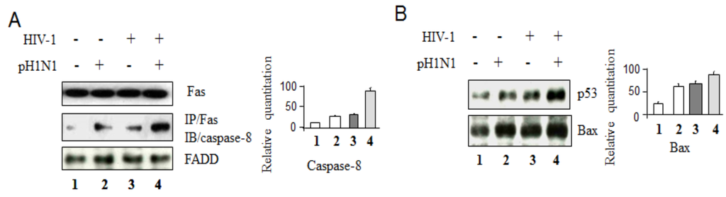 These data indicate that pandemic influenza A (H1N1) infection can induce both Fas-mediated and Bax-mediated apoptotic pathways. A higher level of activation of both apoptotic signaling pathways was found in pH1N1 infected Jurkat cells after HIV-1 infection.