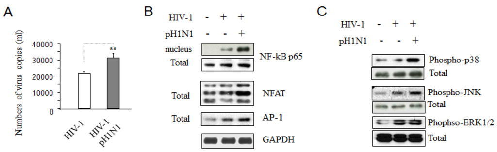 It has been well-known that some host transcription factors are required for HIV replication, including nuclear factor kappa-light-chain-enhancer of activated B cells (NF-κB), NFAT, AP-1, which are up-regulated when T-cells become activated [,,]. They stimulate viral gene expression through transcription with the long terminal repeat (LTR) of HIV-1 []. Cells treated with pH1N1 had higher level of NF-ĸB phosphorylation and increased protein expression of NFAT and AP-1 (Figure 3B) relative to HIV-1 infection alone, suggesting pH1N1 infection can activate host transcription factors required for HIV-1 replication in Jurkat cells.