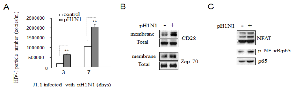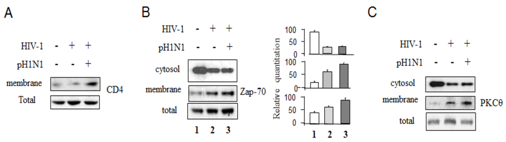 The T cell activation and proliferation control HIV-1 replication and gene expression []; and activation of T cells through involvement of TCR, CD3/CD8, or CD28, can trigger and activate downstream molecules, such as Zap-70 and PKCɵ, and which activate transcription factors, AP-1 NFAT and NF-κB [,], and increase HIV-1 gene expression and replication directed by the HIV-1 LTR []. Activation events of T cells require association with lipid rafts of the plasma membrane [,]. Our results showed that pH1N1 infection increased more Zap-70 and PKCɵ expression on plasma membranes relative to HIV-1 infection alone (Figure 4B,C).