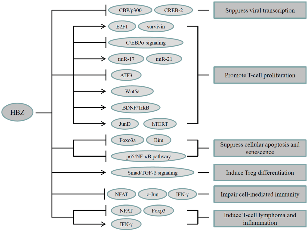 Impaired cell-mediated immunity has been demonstrated in HTLV-1 carriers and ATL patients, causing frequent opportunistic infections by various pathogens [80]. However, the mechanism by which HTLV-1 causes immune deficiency has not been well studied. Sugata et al. observed that HBZ transgenic mice were highly susceptible to intravaginal infection with herpes simplex virus type 2 (HSV-2) and displayed decreased immune responses to primary and secondary infection with Listeria monocytogenes (LM). The production of IFN-γ by CD4+ T cells was shown to be suppressed in HBZ-Tg mice [81]. Previous studies have reported that HBZ suppresses host cell signaling pathways that are critical for T-cell immune response, such as the NF-κB, AP-1, and NFAT (Figure 2) [46,54,56,65]. Indeed, HBZ suppresses IFN-γ transcription through interaction with NFAT and c-Jun. Thus, HBZ inhibits cell-mediated immunity in vivo by interfering with the host cell signaling pathway, suggesting important roles for HBZ in HTLV-1-induced immunodeficiency.