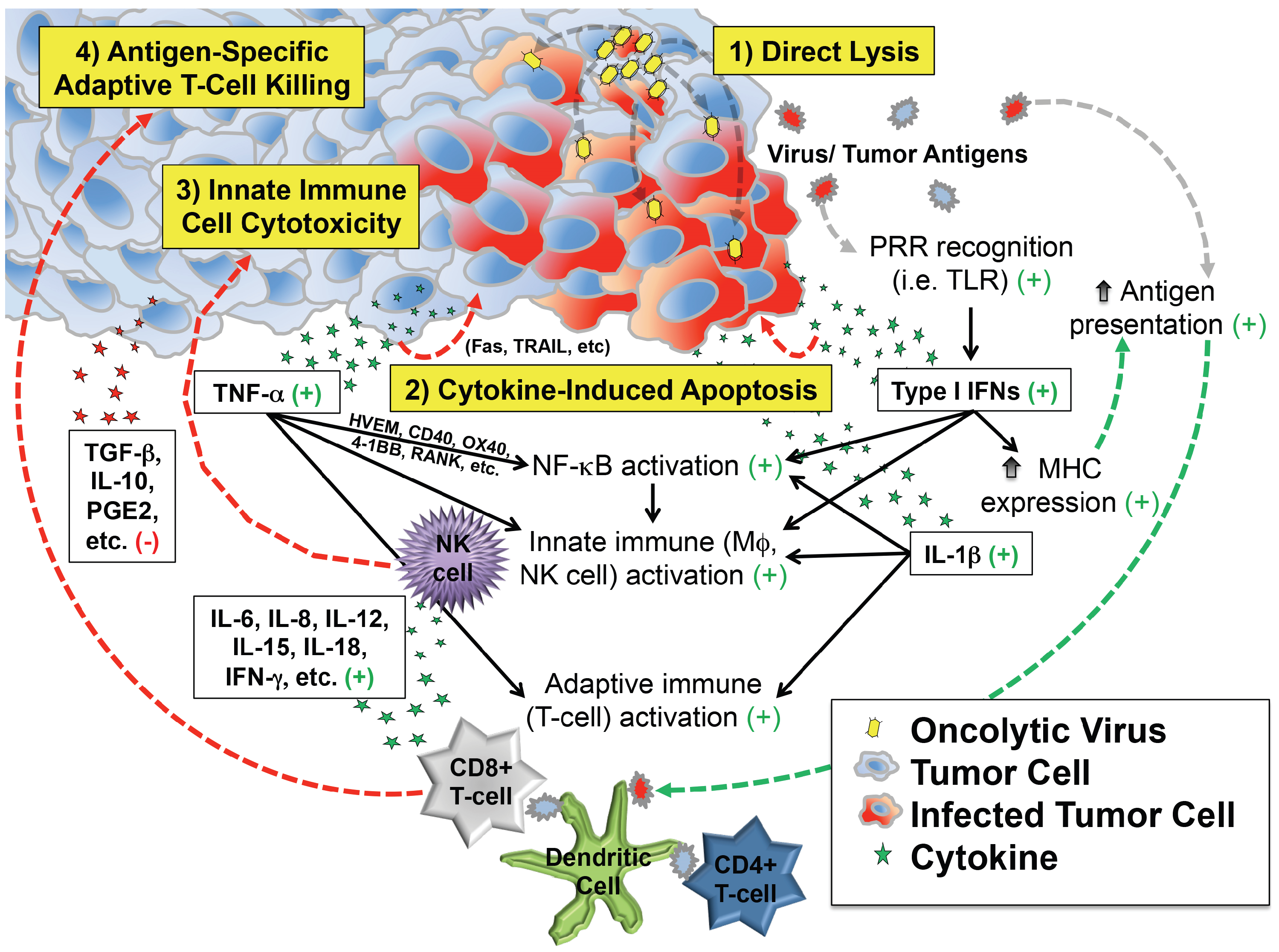 Depiction of critical events beyond infection that contribute to antitumor efficacy of virotherapy. In addition to direct lysis of tumor cells, infection induces secretion of cytokines and chemokines that can kill cancer cells directly and also recruit and activate innate and adaptive immune cells that attack the tumor. Most of the downstream effects of infection are favorable for tumor therapy (indicated by the green plus signs), which counteract immunosuppressive molecules (red minus sign) in the tumor microenvironment.