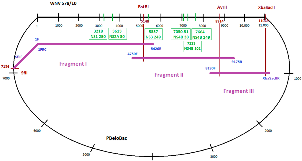 Cloning strategy for the WNV-578/10 genome and positions of the generated mutations. Black numbers represent nucleotide positions in WNV genome/PBeloBac plasmid genome. Red numbers indicate nucleotide positions of restriction enzyme cleavage sites in WNV genome. Green numbers in boxes represent nucleotide positions of inserted mutations. Names of used primers are in blue.