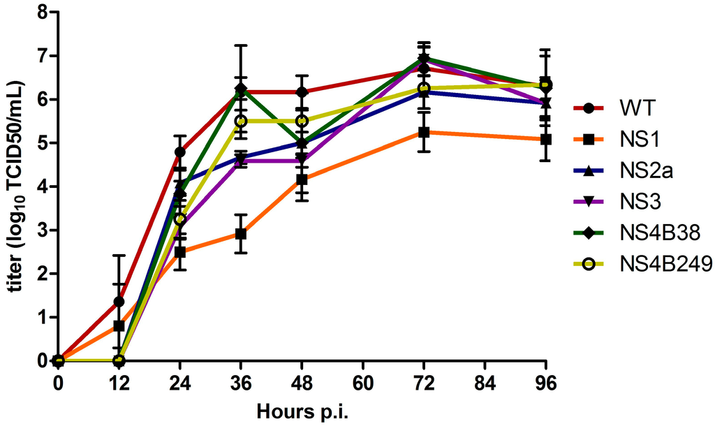 To determine whether passaging the virus stocks led to the introduction of additional mutations, the full genome of the wild type and modified clone virus stocks were sequenced. One nucleotide alteration was found in addition to the mutated sites for three mutant clones, of which two out of three nt changes were silent: G to A on locus 627 of the NS1 clone, and A to G on locus 6768 of the NS4B38 clone. One nt alteration in the genome of the NS4B249 clone resulted in a Valine to Isoleucine change in the NS4B protein at locus 188 (G to A on locus 7480). The in vitro and in vivo characterization was subsequently carried out using the generated clones.