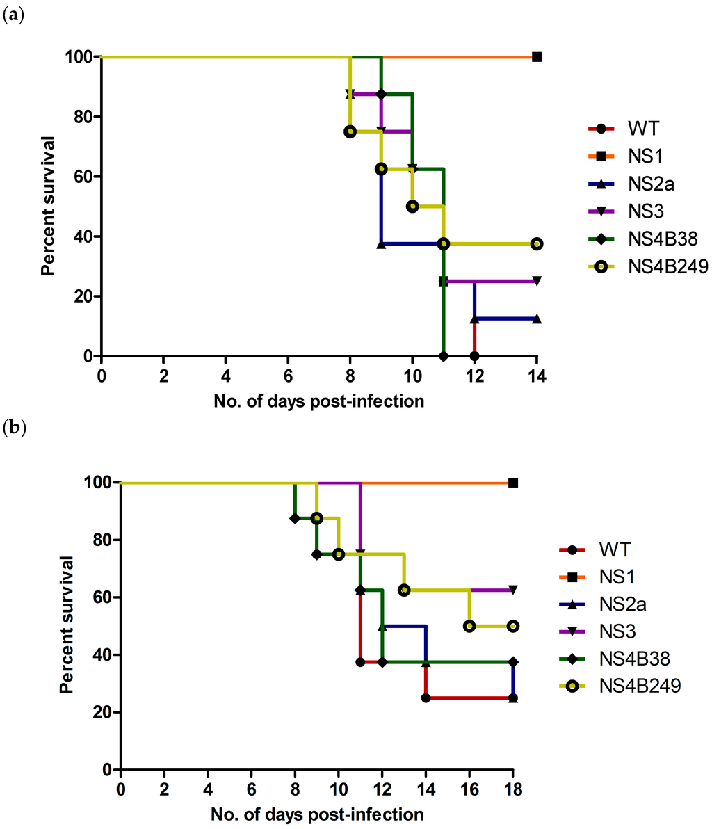 Survival of six-week-old female C57/Bl6 mice after i.p. inoculation, with (a) high dose (104 TCID50) and (b) low dose (101 TCID50) of recombinant WNVs.