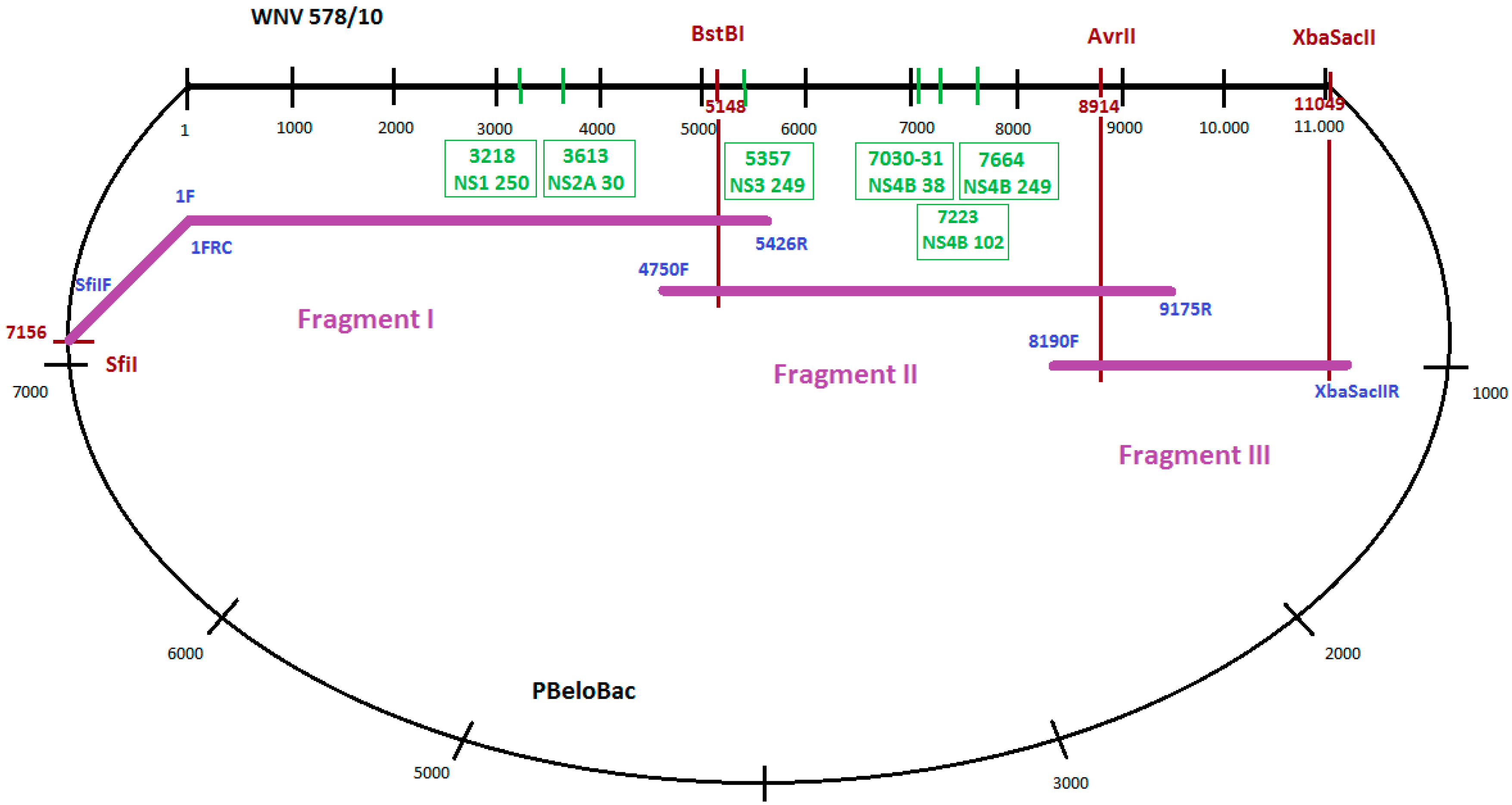 Cloning strategy for the WNV-578/10 genome and positions of the generated mutations. Black numbers represent nucleotide positions in WNV genome/PBeloBac plasmid genome. Red numbers indicate nucleotide positions of restriction enzyme cleavage sites in WNV genome. Green numbers in boxes represent nucleotide positions of inserted mutations. Names of used primers are in blue.