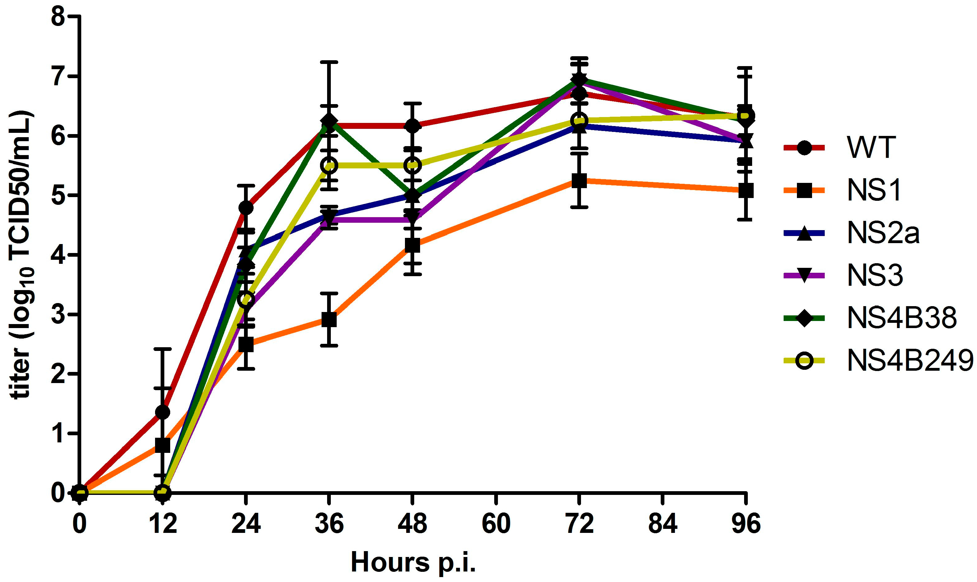 The multiplication kinetics of the mutant WNVs were compared to those of the WT infectious clone-derived WNV-578/10 in Vero E6 cells infected in triplicate at an MOI of 0.1 at 37 °C, sampling every 12 hours. Overall, the infectious virus titers of the clones were significantly different at all time points between 12 h and 96 h p.i. (one way ANOVA; p < 0.02). More specifically, infectious virus titres for WT were significantly higher at 24 h p.i. compared to all the mutated viruses; NS1 (p = 0.005), NS2A, NS3, NS4B38, and NS4B249 (p = 0.03). Moreover, NS1 infectivity titres were found to be significantly lower compared to NS2A (p = 0.03) and NS4B38 (p = 0.03) (Figure 2). At 36 h p.i., WT infectivity titres were only significantly higher compared to NS1 (p = 0.002), NS2A and NS3 (both p = 0.02). At this time point, the difference in infectious virus titres between WT and NS1 was the largest, at approx. 2500-fold. In addition, NS1 titres remained significantly lower compared to all the other viral clones (all, p = 0.03). At 48 h p.i., WT infectious titres were still significantly higher compared to NS1 (p = 0.005), NS2A and NS3 (p = 0.03), while NS1 titres were only significantly lower compared to NS2A (p = 0.04) and NS4B249 (p = 0.03). At 72 and 96 h p.i., WT infectious titres remained only significantly higher compared to NS1 (p = 0.005; 0.02, respectively), while NS1 titres were significantly lower compared to all the other WNV strains at 72 h p.i. (p < 0.04), and compared to NS4B38 and NS4B249 at 96 h p.i. (p < 0.04).