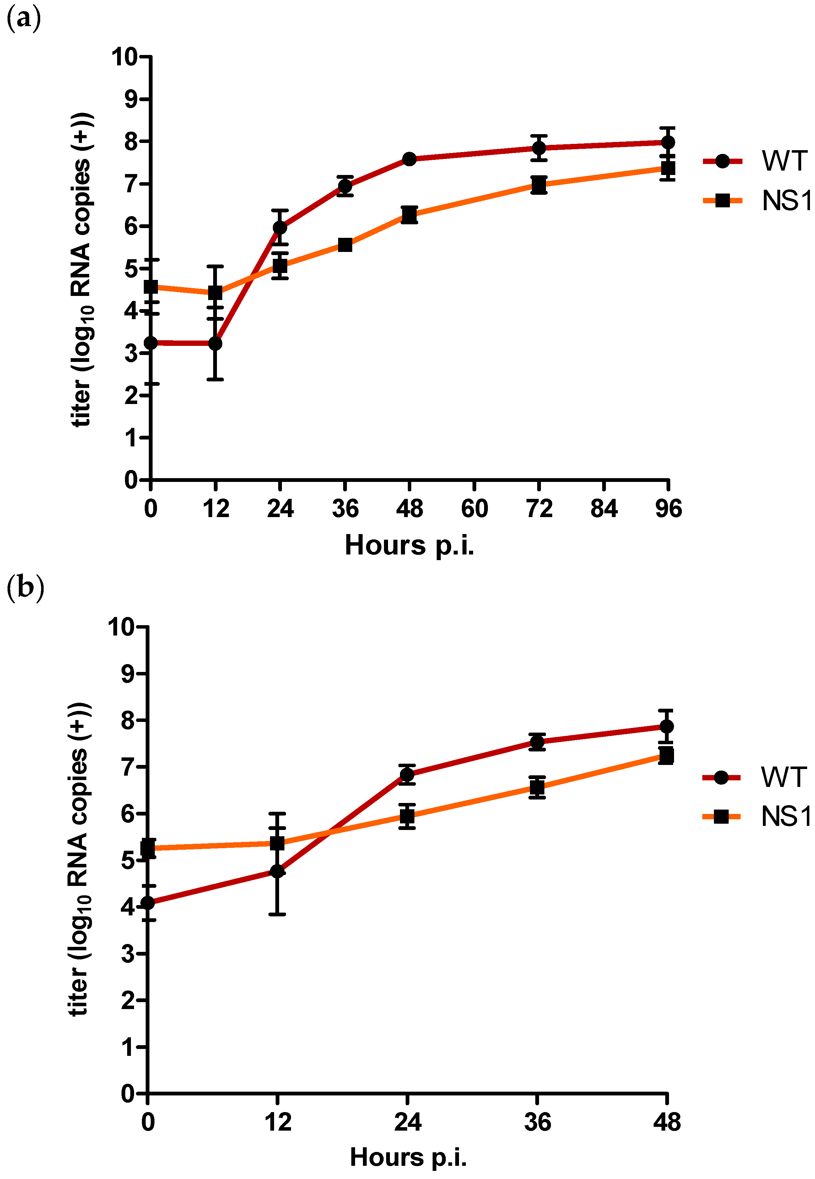 Positive strand intracellular RNA titres were initially also higher for NS1 compared to WT for the first 12 h p.i. (Figure 3b). However, after 24 h p.i., WT positive strand RNA titres had become approx. 0.9 log10 RNA copies higher compared to NS1 (p = 0.002), with the most pronounced difference of approx. 1 log10 RNA copies after 36 h p.i. (p = 0.002). At 48 h p.i., positive strand RNA titres were still significantly higher for the WT compared to NS1 (p = 0.004) but the difference had decreased to approx. 0.6 log10 RNA copies (Figure 3b).