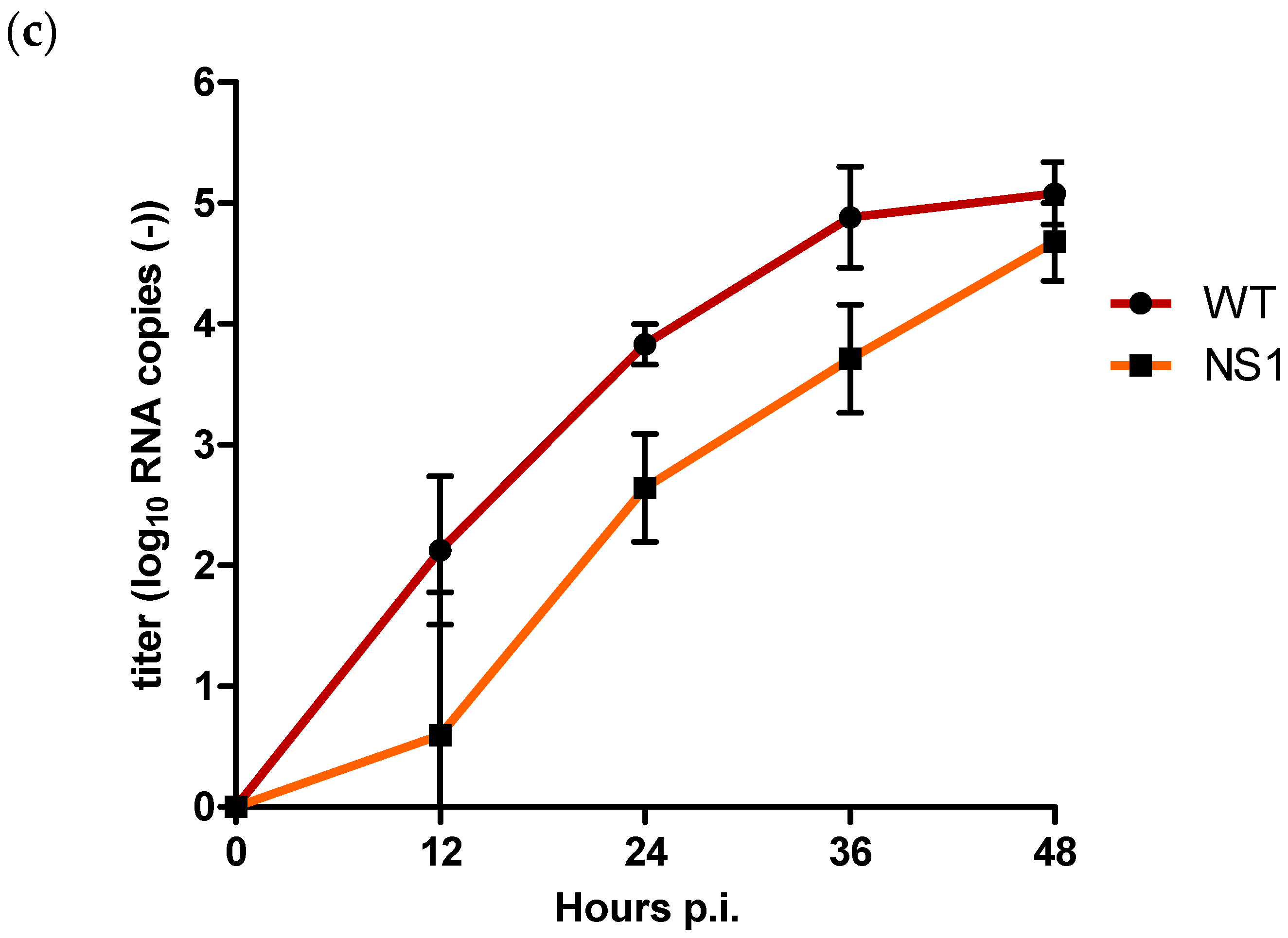 For intracellular negative strand RNA copies, titres for NS1 were already significantly lower compared to the WT at 12 h p.i. (p = 0.02) (Figure 3c). NS1 negative strand RNA copies remained significantly lower compared to the WT with a difference of approx. 1.2 log10 RNA copies at both 24 and 36 h p.i. (p = 0.002). After 48 h p.i., titre differences decreased to approx. 0.4 log10 RNA copies, at which point the difference was no longer statistically significant (p = 0.06) (Figure 3c).