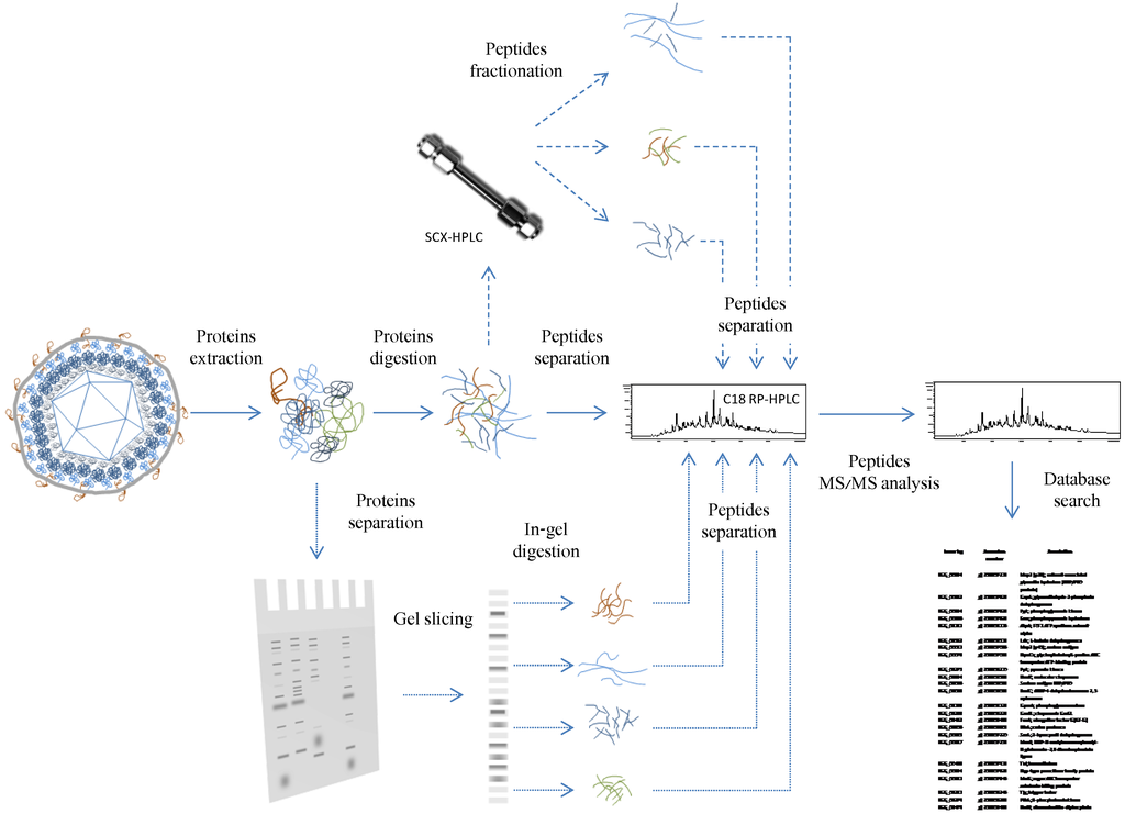 In the targeted analyses, only visually detected protein bands were submitted to enzyme digestion and MS identification. In the untargeted analyses, the entire gel lane is cut into slices (usually 20 to 30 slices), which are then submitted to protein digestion. In this case, gel cutting is made independently of the visual detection of proteins. The rational for choosing the untargeted strategy is that the sensitivity of modern mass spectrometers is higher than the limit of detection of common protein staining protocols. It is thus very common to identify proteins in a gel region where protein staining revealed nothing. However, the untargeted gel-based analysis is somewhat time-consuming because the complete gel needs to be analyzed rather than just the region in which proteins are detected by staining. In contrast, the time needed for both sample preparation and analysis is definitely shorter in the gel-free approaches. This type of a workflow requires minimal sample manipulation and can be much more easily automated. As both the machine time and the manpower are very often limiting factors, the gel free analysis represents a real alternative, especially if several samples need to be analyzed. Nevertheless, for gel-free approaches to be as efficient as gel-based approaches, a 2D-LC workflow is necessary, which requires less common equipment. However, it is not clear how these two strategies compare in terms of efficiency, i.e., number of detected proteins. Indeed, it is highly difficult to compare the efficiency of all of these methods because they have not often been performed in the same lab with the same instrument or started with the same sample. In our lab, we have analyzed four structural proteomes with both 2D-LC MS/MS and SDS-PAGE LC MS/MS [25,27,28] (and unpublished results). Depending on the virus analyzed, one of the two methods was determined to be optimal. The gel free approach proved to be the best for Cyprinid herpesvirus 3 (CyHV-3), whereas the gel-based workflow was more efficient for Anguillid herpesvirus 1 (AngHV-1), Bovine herpesvirus 4 (BoHV-4) and Murid herpesvirus 4 (MuHV-4) [27,28,29].