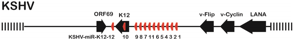 Kaposi’s sarcoma-associated herpes virus (KSHV) is the etiological agent causing Kaposi’s sarcoma (KS), primary effusion lymphoma (PEL) and a subset of multicentric Castleman’s disease (MCD) [1,2,3]. KSHV, also named Human Herpesvirus Type 8 (HHV-8), is a γ-herpesvirus which significantly contributes to mortality of HIV-infected individuals or patients undergoing organ transplants [3]. Most cells in KSHV-associated malignancies are latently infected and express only a very limited number of viral genes, which contribute to viral pathogenesis and/or tumorigenesis by targeting a number of host regulatory pathways (reviewed by [4]). In addition to four major latency associated protein-encoding genes (LANA, v-FLIP, v-Cyclin, and the Kaposin family of proteins), the major KSHV latency-associated region (KLAR) also encodes 12 microRNA (miRNA) genes (Figure 1).
