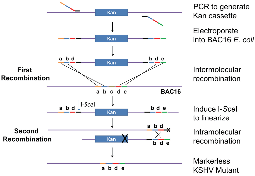 Two-step recombineering. Primers are designed to PCR amplify the kanamycin-resistance cassette. The primer tails match KSHV sequences (abd for the forward primer and bde for the reverse primer). Note that sequence c will be deleted in the final construct. The PCR product is electroporated into E. coli cells carrying BAC16, and intermolecular recombination generates a kan-resistant bacmid. Induction of I-SceI results in linearization of the bacmid. Intramolecular recombination between sequences bd near the ends of the molecule produces the final markerless KSHV mutant bacmid, with sequences abde. Modified from [23,24].