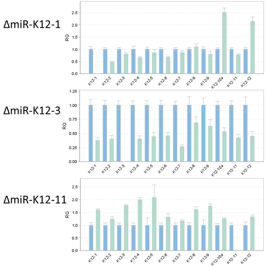 Confirmation of loss of miRNA expression in deletion mutants for miR-K12-1, miR-K12-3, and miR-K12-11. TaqMan miRNA assay was used to determine the levels of mature miRNAs K12-1 through K12-12 (strand-specificity for each Taqman miRNA assay is listed in Table S1). The blue bars show expression for wtKSHV normalized to 1. The cyan bars show expression levels for KSHV deleted for miR-K12-1 (top), miR-K12-3 (center), or miR-K12-11 (bottom).