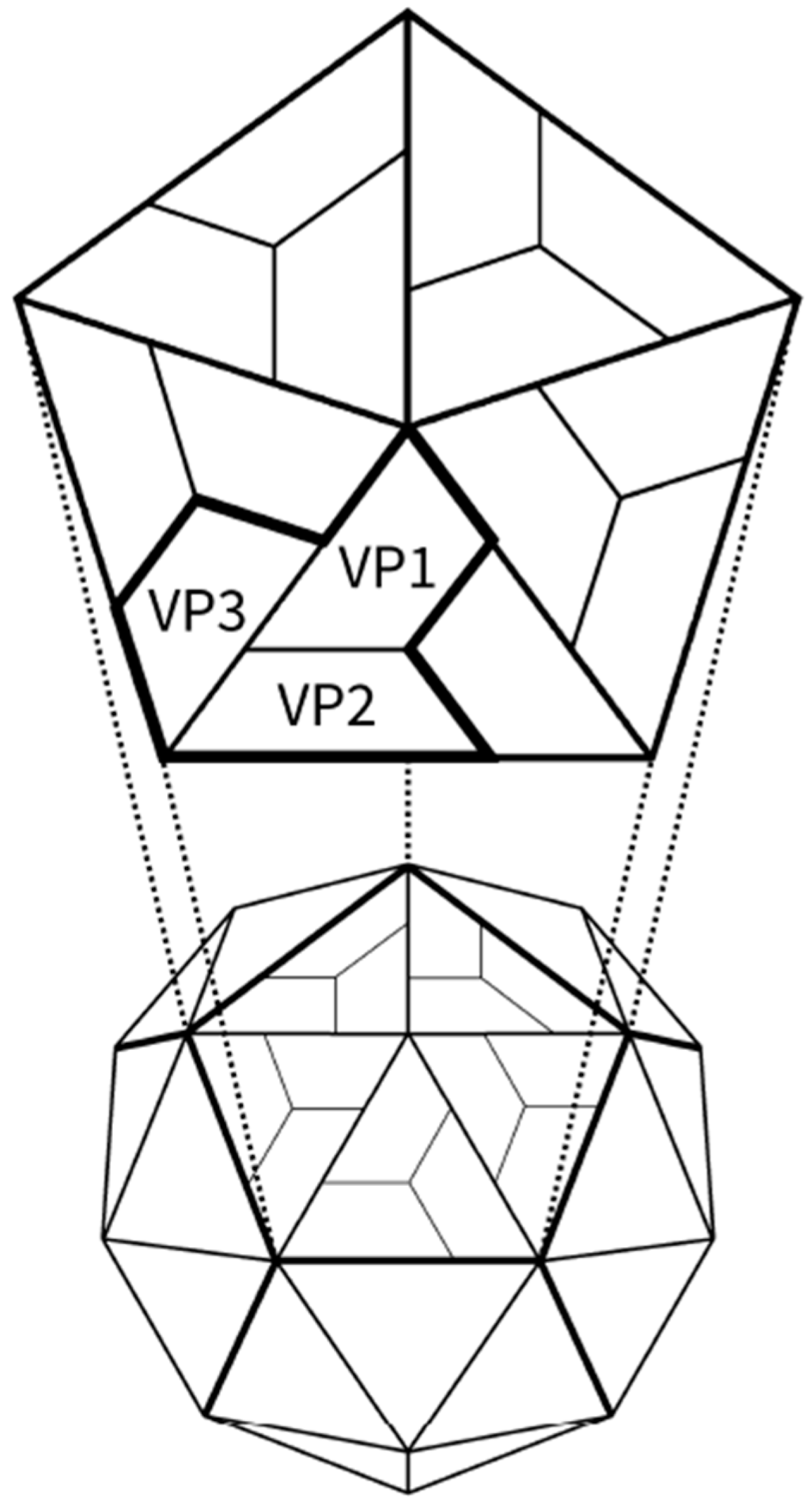Schematic presentation of enterovirus structure. Icosahedral capsid of enteroviruses is composed of 12 pentameric units. The pentamer contains five protomeric subunits around five-fold symmetry axes. Positions of surface-exposed capsid proteins VP1, VP2 and VP3 are shown.