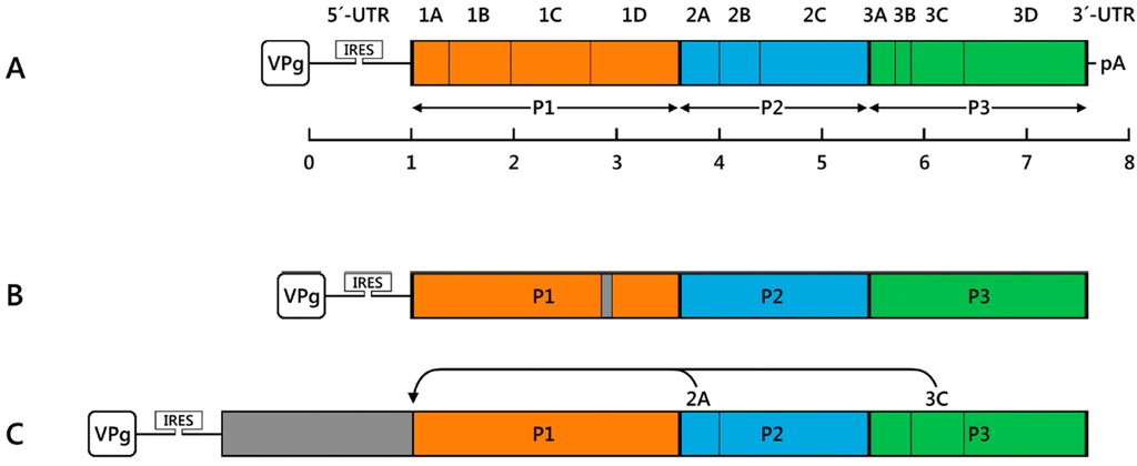 Although seemingly easy, the compact size and the structure of the enterovirus genome limit the size of the inserts or generation of the protein fusions when preparing recombinant viruses. The enterovirus genome is composed of a 5′-terminal untranslated region (UTR) followed by the structural proteins (VP4, VP2, VP3 and VP1), non-structural proteins (2A–C and 3A–D), and short UTR at the 3′-terminus (Figure 1A). The enteroviral RNA lacks a 5′-terminal cap structure and therefore relies on translational initiation through internal ribosomal entry [,]. The internal ribosomal entry site (IRES), a complex cis-acting genetic element with an extensive secondary structure, mediates cap-independent translation of the viral genome. During the replication cycle a long polyprotein is translated and processed into functional viral proteins by viral proteases (2Apr° and 3Cpr°) [,,]. The structural integrity and polyprotein translation strategy thus define the useful sites for genetic insertion. Earlier studies to identify the optimal size and site for the insert have been important because the site has a significant effect on the stability of the genome. These studies have resulted in identification of several sites, which have been used to generate viable and stable recombinant human enteroviruses. The strategies for vector development using some of the most important enteroviruses will be addressed in the following chapters.