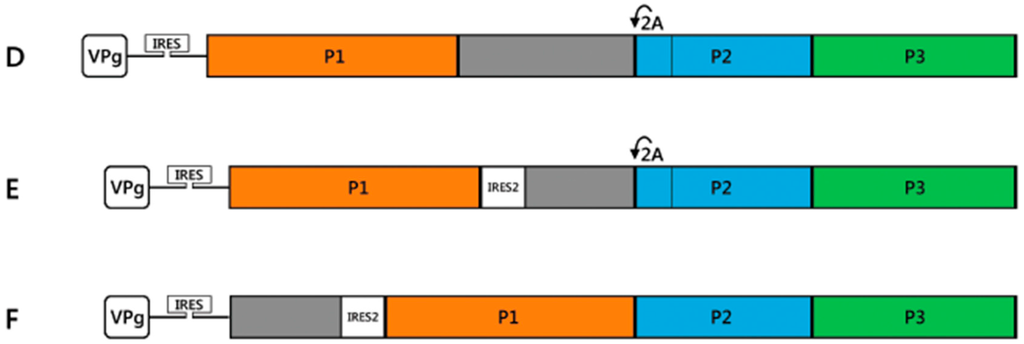 The genetic structure of enterovirus expression vectors. (A) Schematic representation of the enterovirus genome (drawn in the scale except for the internal ribosomal entry site (IRES) region and the inserts); the conserved and highly-structured 5′- and 3′-untranslated regions (UTRs) are indicated and the major proteolytic products of the viral polyprotein (P1, P2, and P3) are outlined by colored boxes. The 5′-end of the genome is covalently bound by viral genome-linked protein, VPg and 5′-UTR contains an IRES for cap-independent translation. The 3′-UTR contains a short polyA tail (pA); (B) Epitope display vectors contain short foreign inserts to display epitopes (in grey) within the P1 structural protein-encoding region; (C,D) Protein expression vectors. Foreign sequences fused to the viral ORF at its 5′-end or between the coding regions for P1 and P2. Artificial proteolytic cleavage sites for the viral 2Apr° and/or 3Cpr° proteases (indicated by curved arrows) are used for proteolytic processing of the fusion polyprotein; (E,F) Dicistronic vectors. Foreign inserts placed under the control of a secondary IRES element (IRES2) (originating from a related picornavirus) between P1 and P2. Alternatively, the upstream cistron is formed by the foreign insert driven by the original IRES, and the viral polyprotein is expressed under the control of the IRES2.