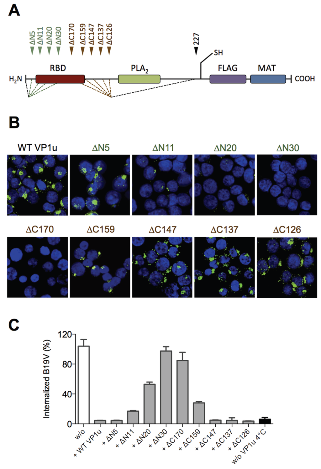 Localization of the receptor-binding domain (RBD) within the VP1u. (A) Schematic depiction of the recombinant VP1u protein (227 AA) and the introduced truncations. N-terminal truncations (green): ∆N5, ∆N11, ∆N20, ∆N30. C-terminal truncations (brown): ∆C126, ∆C137, ∆C147, ∆C159, ∆C170. Motifs: Receptor-binding domain (RBD, brown); phospholipase A2 (PLA2, AA 130–195, green []); introduced unique cysteine (C228); FLAG tag for immunodetection (violet); metal affinity tag (MAT) for Ni-NTA-purification (blue); (B) Representative immunofluorescence images of VP1u internalization (green signal) into UT7/Epo cells. VP1u protein variants were internalized at 37 °C for 1 h and detected by αFLAG antibody; (C) Quantification of B19V uptake in presence of VP1u protein variants as competitors (n ≥ 2). Values were normalized to unhindered internalization without VP1u (white bar). Control for no internalization (black bar) was kept at 4 °C instead of incubation at 37 °C. All samples shown in (B,C) were trypsinized after incubation at 37 °C to remove uninternalized VP1u in (B) and B19V in (C), respectively.