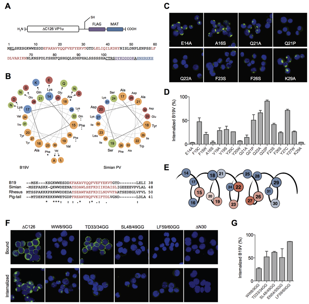 Structural and functional motifs within the RBD. (A) Schematic depiction of the recombinant ∆C126 VP1u and its amino acid sequence (AA 1–101 of the VP1u). The sequence of the ∆C126 harbors three predicted helices (red): AA 14–31 (helix 1), 35–45 (helix 2), and 59–68 (helix 3). Sequences of the expression vector (underlined) include the unique cysteine, the FLAG tag (violet), and the metal affinity tag (blue); (B) Modeled helical wheel of the conserved helix 1 and the alignment of the erythroparvovirus N-termini. The helical wheel of B19V shows the circular distribution of the AA 14–31 within helix 1 and displays the spatially related clusters of erythroparvovirus-conserved amino acids. Amino acid variations found in B19V isolates are arranged in a wider radius. The amino acids are colored according to their chemical classification: hydrophobic = yellow; polar = green; basic = blue; acid = red. The helical wheel of the simian parvovirus helix 1 is shown on the right side. The erythroparvovirus sequences from B19V, simian, rhesus macaque, and pig-tailed macaque parvovirus were aligned with ClustalW2. The secondary structure prediction with JPred shows the conservation of helix 1 (red) in all four erythroparvovirus members; (C) Representative immunofluorescence images of internalized recombinant VP1u mutants (green) into UT7/Epo cells; (D) Cellular uptake of B19V in the presence of recombinant VP1u mutants and quantification of internalized B19 virions by qPCR; (E) Schematic summary of the obtained data (B–D). The color of amino acids within helix 1 shows their relevance for the VP1u internalization function: red (important) to blue (not relevant); (F) Binding and internalization of double-glycine mutants and controls (∆C126, ∆N30); (G) B19V internalization in presence of the different GG-mutants. For all qPCR results n ≥ 2.
