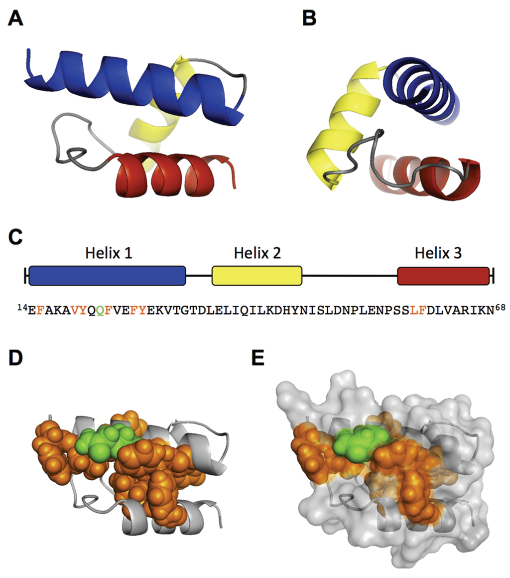 Ab initio modeling of the RBD. The central part of the RBD region (AA 14–68) was modeled by QUARK. (A) Front view of model 1 with the N-terminus left and C-terminus right. Helix 1 = blue (AA 14–31), helix 2 = yellow (35–45), helix 3 = red (57–68). Helix 1 shows a similar orientation as the schematic depiction in Figure 2E; (B) side view of (A), showing helix 1 similar to the helical wheel in Figure 2B; (C) Helix distribution and sequence of the modeled AA 14–68. The important amino acids for VP1u internalization are colored in orange (hydrophobic) and green (polar). The spatial cluster of the important amino acids is depicted as spheres in the helical structure (D) and in the surface model (E) of the RBD. Estimated TM-score of the shown Model 1: 0.5200 ± 0.0833. The structure was visualized with PyMOL.