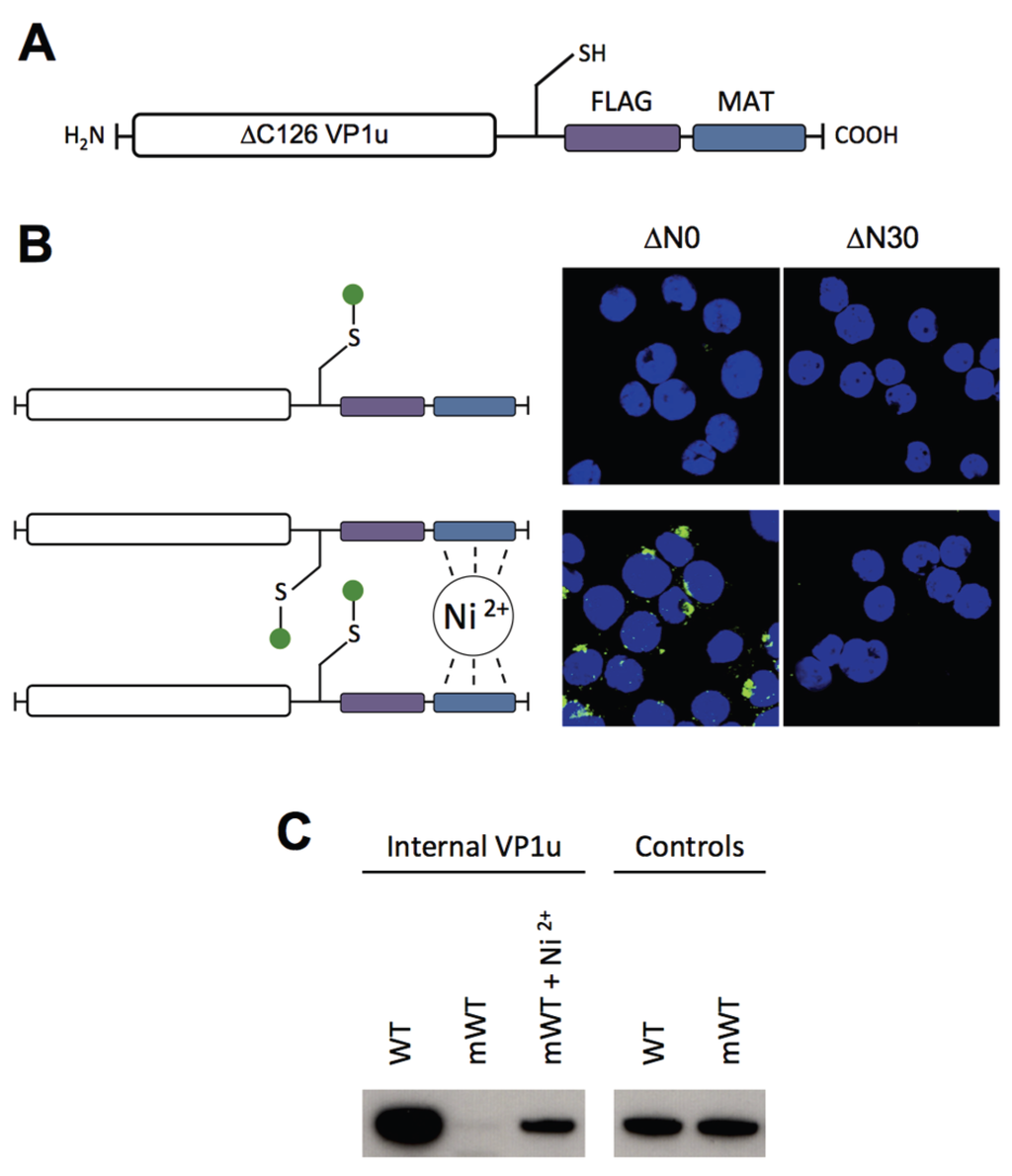 Internalization of VP1u monomer and dimer. (A) Recombinant ∆C126 VP1u with unique cysteine (-SH) for specific crosslinking with maleimide-fluorescein; (B) Schematic depiction of fluorescein-labeled ∆C126 VP1u (left), which was internalized into UT7/Epo cells and detected by fluorescence microscopy (right). Fluorescein-labeled ∆N30/∆C126 VP1u was used as a negative control; (C) Western blot of internalized WT VP1u (WT), monomeric C228G VP1u (mWT), and monomeric VP1u supplemented with 10 µM Ni2+. Controls show the relative input of WT and mWT in the internalization experiment.