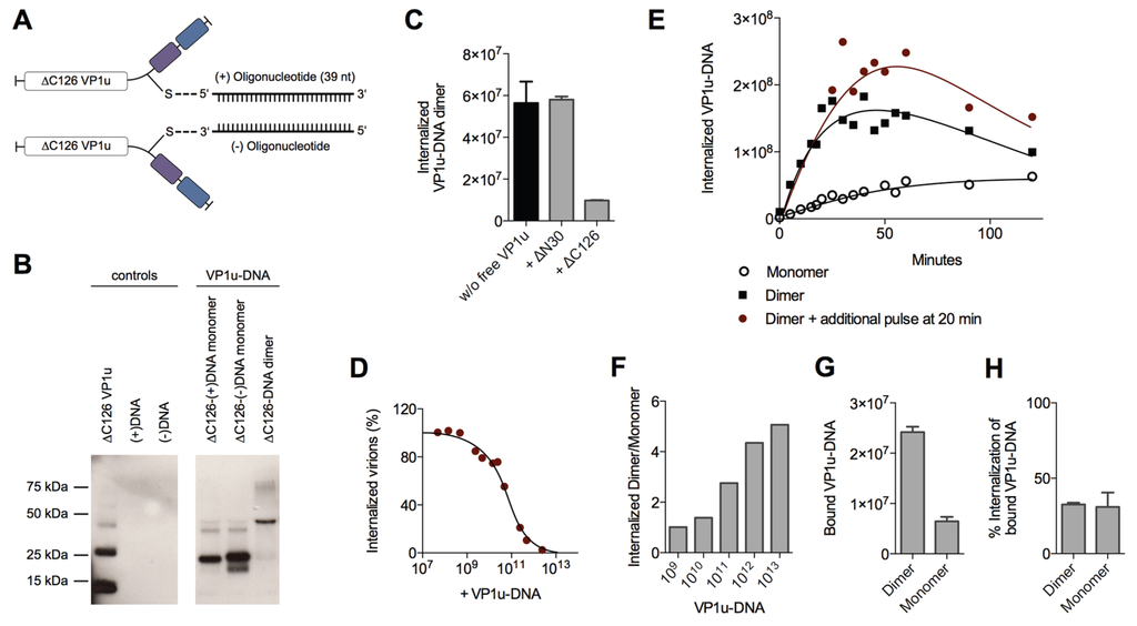 To elucidate whether the enhanced VP1u dimer internalization is due to an increased binding affinity or due to a more efficient endocytosis, we measured the binding capacity of the VP1u dimer and monomer, and further determined the following internalization of the bound VP1u. The results show that the VP1u-DNA dimer binds significantly better than the monomer (Figure 5G). In contrast to this, the VP1u internalization efficiency of the bound dimer or monomer variants was similar (Figure 5H). In conclusion, the enhanced VP1u dimer internalization compared to the monomer correlates with its increased binding capacity.