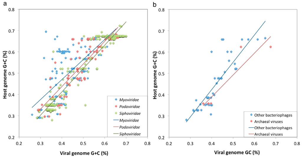 First, we examined the genomic G+C% (Figure 2). The results showed significant correlations in the genomic G+C% between viruses and their hosts across different groups of viruses, being consistent with previous observations [14]. Since host organisms provide a variety of molecular building blocks and machinery required for viral reproduction, the nucleotide compositions of viruses can reflect the adaptation to their surrounding cellular environments or to host machinery. The correlation was weaker for Myoviridae (r = 0.755) than for other Caudovirales (Siphoviridae, r = 0.969; Podoviridae, r = 0.892) (Figure 2a), which could be explained by the existence of broad host range myoviruses encoding tRNA genes [15]. Indeed, when we analyzed myoviruses without tRNA genes, we obtained a higher correlation coefficient (r = 0.945).