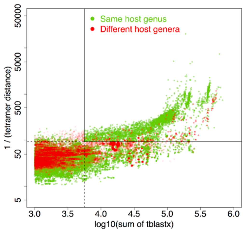Second, we used the paired taxonomic information to assess a computational method for host prediction. Genomic features of phages and their hosts can be used to predict phage-host pairs [16,17]. Here, we analyzed the relationship between the host taxonomic similarity and phage inter-genome sequence similarity. The underlying assumption is that if two phages have similar enough genomes in terms of both sequence and nucleotide composition similarities, then the two phages may be evolutionarily highly related and thus may share the same or related hosts. From the Virus-Host Database, we extracted a set of 1,057 genomes of phages that are known to infect 107 distinct bacteria. As a proxy for overall phage genome sequence similarity, we used the logarithm of the sum of the TBLASTX scores [18] between the two phage genomes. For compositional similarity, we used one divided by the Euclidean distance [19] based on tetramer frequencies. As shown in Figure 3, phages showing high inter-genomic similarity by both measures tend to infect similar hosts (i.e., same host taxonomy at genus level). By setting appropriate thresholds for sequence and compositional similarities (>3.75 and >93, respectively), we were able to predict pairs of phages infecting hosts of the same genus with a precision of 95.42% and a recall of 11.5%. This method solely relies on the genomic data of phages (i.e., sequence and nucleotide composition similarities between phage genomes) and correctly predicted 4582 phage pairs with the same host genus (between 759 distinct phages). In comparison, Roux et al. [17] previously reported a prediction method based on nucleotide composition similarities between phage and host genomes with a higher precision (98.98%) but with a lower recall (0.76%) than our method. Therefore, the presented approach holds a potential (which will grow as reference databases are enriched) for predicting hosts of unknown phage sequences (such as those obtained by metagenomics projects [20]) solely based on their similarity with known viral genomes.