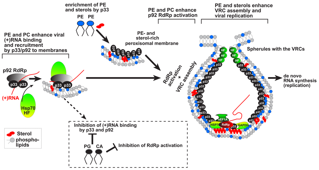 Stimulation of replicase activation in vitro: An interesting feature of the tombusvirus RNA-dependent RNA polymerase (RdRp) is that it requires an activation step after its translation to become functional in a membrane-bound form [,]. An in vitro activation assay was developed for the TBSV p92pol that demonstrated the need for the auxiliary p33 replication protein, two cis-acting elements in the viral (+)RNA template and the co-opted heat shock protein 70 (Hsp70) in combination with cellular membranes [,,,]. Subsequent detailed analysis of the roles of various phospholipids in p92pol activation has revealed the stimulatory function of PE and PC (phosphatidylcholine) on the in vitro RdRp activity, while PG (phosphatidylglycerol) showed a dominant inhibitory effect on RdRp activation and binding of p92pol to the viral (+)RNA []. These results suggest that the phospholipid composition around the TBSV p92pol affects RdRp activity. Thus, the accessibility of various phospholipids in the targeted membranes might be an important regulatory mechanism for new VRC assembly during the course of tombusvirus infection (Figure 1).