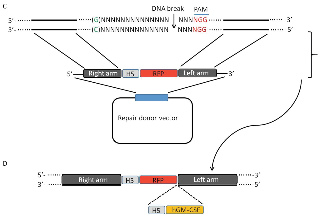 gRNA guided Cas9 induces homologous recombination by creating a DNA double-stranded break in the target region of vaccinia virus. (A) The gRNA is transcribed; (B) gRNA guides Cas9 to the target site; (C) Cas9 creates a DNA double-stranded break, which is repaired by the repair donor vector via the mechanism of homologous recombination; and (D) the mutant vaccinia virus is generated with the deletion of the target gene and insertion of the purification marker RFP containing its promoter H5. A therapeutic gene hGM-CSF and its promoter H5 can also be incorporated into the target gene.
