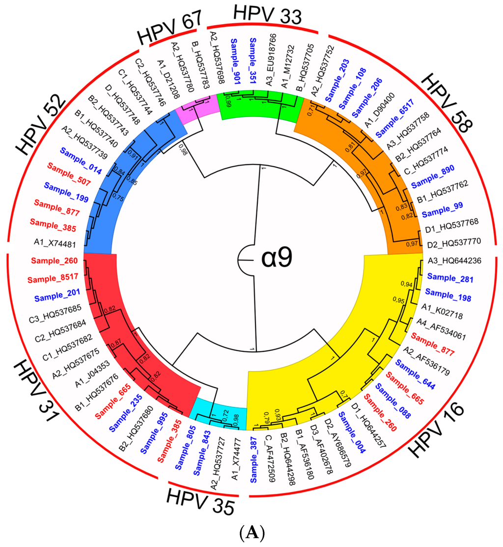 As regards phylogeny, distinct phylogenetic trees were generated for HPV species α-7, α-9, and α-5/α-6 by using the Maximum Likelihood method. The phylogenetic trees included reference sequences for all known variant lineages/sublineages and the HPV sequences obtained from clinical samples (Figure 1). In the figures, HPV types within each species are highlighted with different colors, while numbers close to the nodes represent the percentage of times in which the sequences subsumed by the node were found in the same cluster in bootstrap iterations.