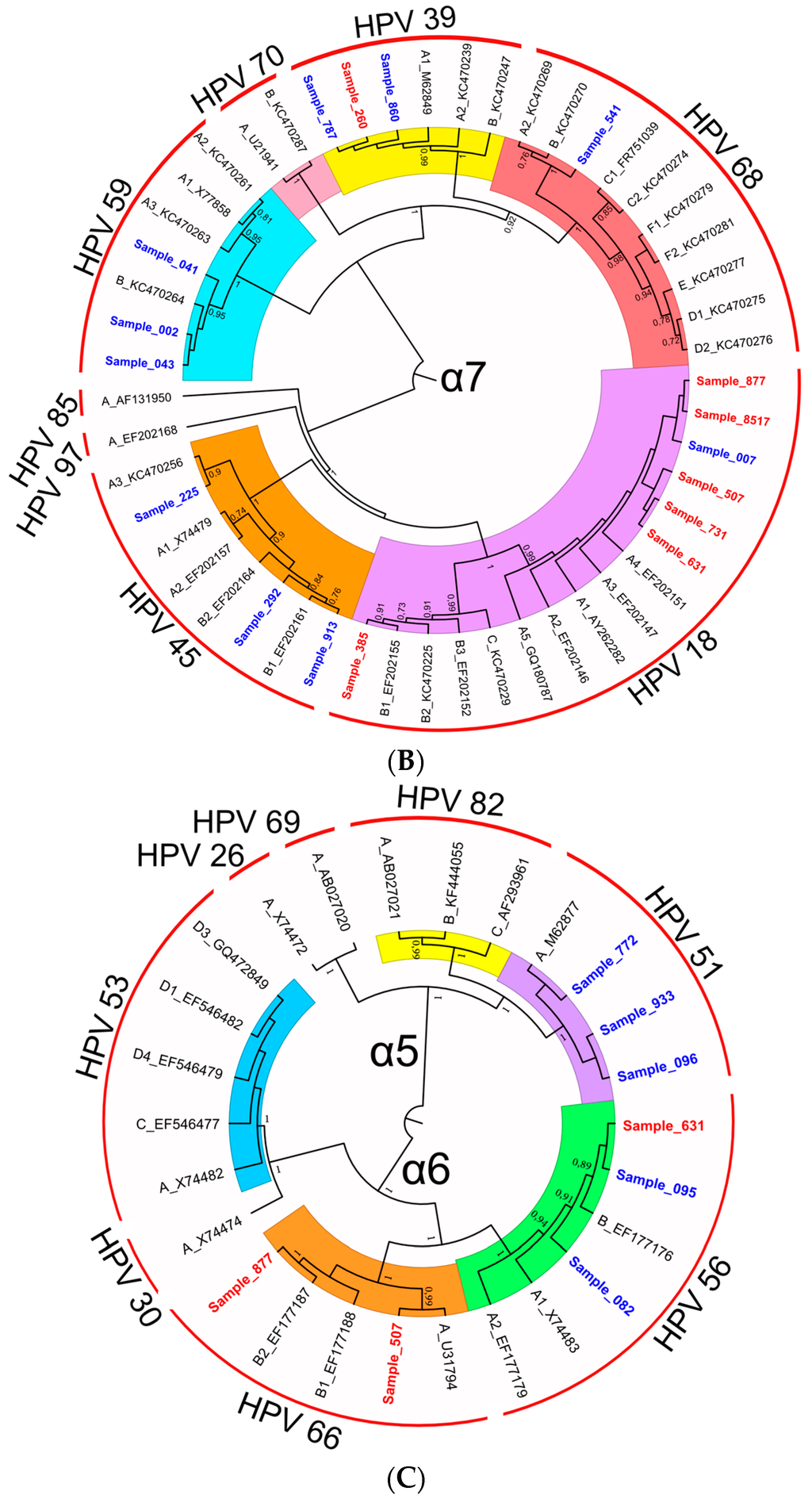 (A–C) Phylogenetic trees of HPV E6/E7 sequences obtained from clinical samples (red and blue labels for sequences obtained with 454 pyrosequencing and Sanger, respectively) and references (black labels) belonging to the α-9 (A); α-7 (B); α-5 and alpha-6 (C) species inferred by using the Maximum Likelihood method based on the Tamura 3-parameter model [51] (A) and the Hasegawa-Kishino-Yano model [52] (B,C). The percentage of bootstrap replications in which the associated samples clustered together is shown next to the branches (over 1000 iterations). A discrete Gamma distribution was used to model evolutionary rate differences among sites (5 categories: +G, parameter = 0.6006 (A), 1.1395 (B), 1.6034 (C)). Tree branch lengths are proportional to the number of substitutions per site. There were a total of 741, 796, and 695 positions, respectively, in the final dataset of phylogenetic trees (A–C). Evolutionary analyses were conducted in MEGA6 [40] and displayed with FigTree [53]. Sample labels include sample ID; reference sequence labels include the GenBank accession number and the ID of variant lineages/sublineages (variant lineages are designed as A, B, etc.; variant sublineages are designed as A1, A2, etc.).