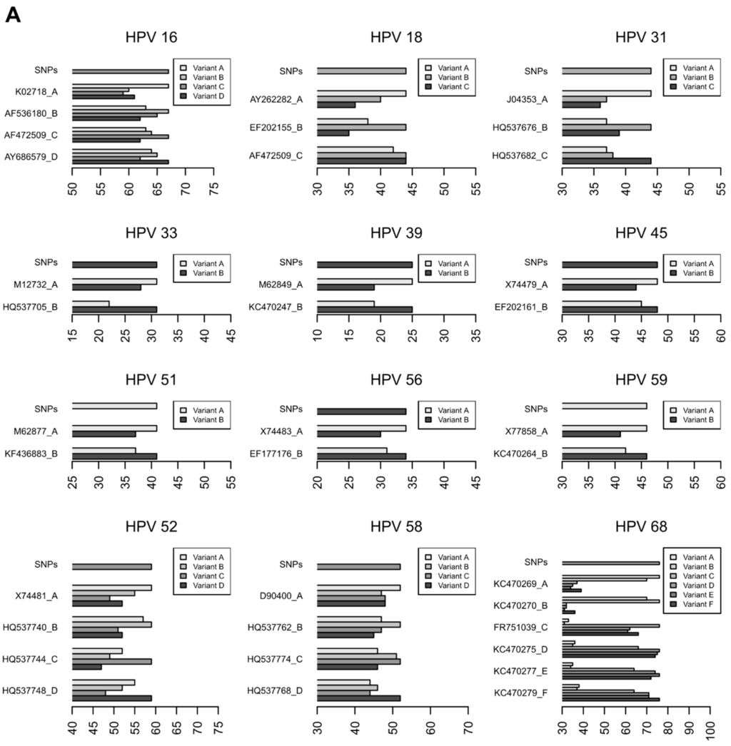 Differences in oncogenic activity have been demonstrated among HR-HPV types (e.g., HPV16 is the most potent HPV type, able to cause cancer at different anatomic sites, at variance with the other oncogenic HPV types that have been associated with cervical cancer but rarely with other types of cancer). In addition, clinical and experimental studies have shown that the presence of nucleotide changes in some HPV intra-type variants may be associated with increased oncogenic activity and probability to induce cancer [6,8,9,10,11]. For example, non-European lineages of HPV16 have been associated with an increased risk of persistent viral infection and development of cervical precancer and cancer amongst European populations [11,12,13,14]; A1 sublineage of HPV33, B2 sublineage of HPV45, and A1 and A3 sublineages of HPV58 have been found to be overrepresented in cervical cancer [9,10,11].