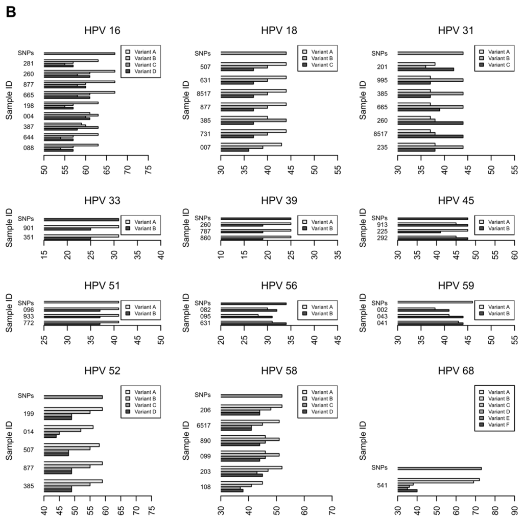 In conclusion, this study reports the design and validation of a NGS-based method for characterization of HR-HPV intra-type variants in clinical samples. Notably, the primer set can be adapted to Sanger sequencing and different NGS platforms. This method could be used both for epidemiological studies on the distribution of HPV lineages and for diagnostic purposes. Diagnostic applications may include second line testing in patients with HR-HPV infection, to identify infections associated with increased risk of persistence and disease progression [9,13]. This test could be used together with other biomarkers, e.g., presence of HPV16/18/45, HR-HPV E6/E7 mRNA expression, p16INK4a expression and HPV genome methylation, which have been also associated with an increased risk of progression to malignancy or have been used to define the causative role of HPV in cancer [61,62]. Characterization of HR-HPV variants, especially for HPV types other than HPV16 and HPV18, will be a relevant biomarker in programs for the secondary prevention of HPV-related cancer in the era of prophylactic HPV vaccination.