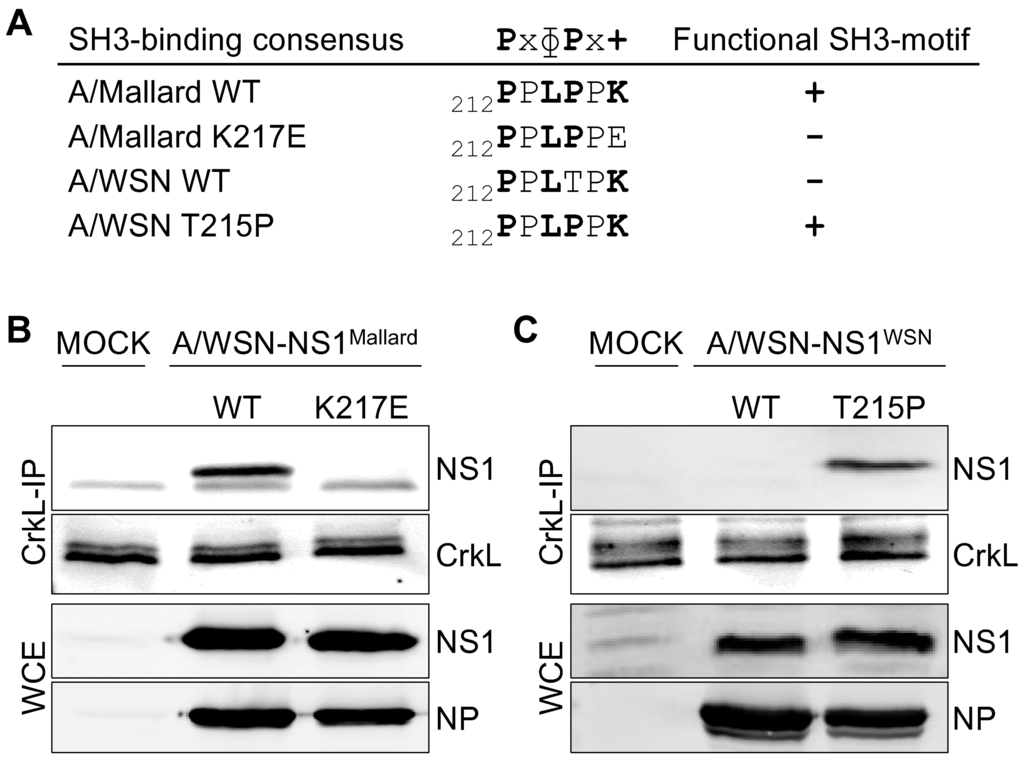 To establish that the engineered mutations had the expected effects on the capacity of the corresponding A/Mallard and A/WSN NS1 proteins to interact with Crk proteins in IAV infected cells, we immunoprecipitated endogenous CrkL (Figure 1B,C) from mock infected or recombinant virus-infected A549 cells and examined NS1 co-precipitation by Western blotting. As seen in Figure 1B, while wild-type A/Mallard NS1 readily co-precipitated with CrkL, the NS1 mutant (K217E) did not associate with CrkL at detectable levels. Conversely, no association of wild-type A/WSN NS1 with CrkL could be detected, whereas efficient co-precipitation of the mutant NS1-T215P protein with a restored Crk SH3-binding motif was observed (Figure 1C).