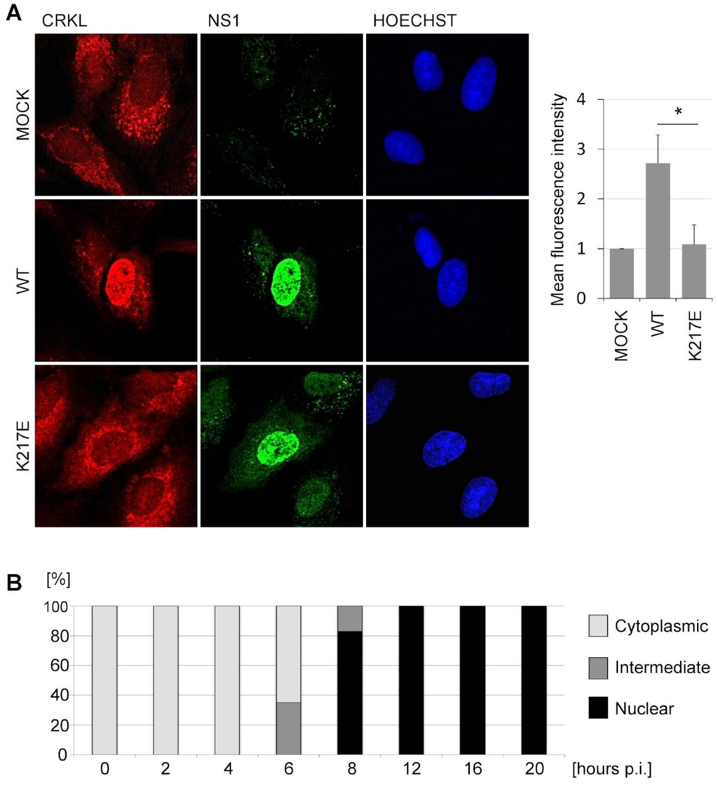 Infection of cells with IAV expressing SH3 binding-competent NS1 causes nuclear relocalization of CrkL. (A) Immunofluorescence staining of NS1 and CrkL in A549 cells that were mock-infected (upper panel) or infected with A/WSN-NS1Mallard(wt) (middle panel) or A/WSN-NS1Mallard(K217E) (bottom panel) for 20 h at a MOI 0.5. The nuclei were visualized by staining with Hoechst. The mean intensity of CrkL fluorescence in the nuclei was quantified from 50 cells infected with A/WSN-NS1Mallard(wt) or A/WSN-NS1Mallard(K217E) that also stained positive for positive for NS1, and was normalized to the mean fluorescence intensity of CrkL immunostaining of 50 mock-infected cells. The standard error is presented in the figure. The statistical significance of the differences was determined by Student′s t-test (* p < 0.001); (B) A549 cells were infected with A/WSN-NS1Mallard(wt) for different time points at a MOI 0.5. The localization of CrkL was scored from 100 cells as a cytoplasmic, an intermediate, or a nuclear pattern.