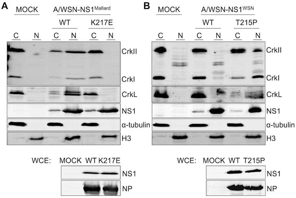 Nuclear translocation of CrkI, CrkII, and CrkL by SH3 binding-competent NS1 proteins demonstrated by subcellular fractionation. (A) Western blot analysis of cytoplasmic (C) and nuclear extracts (N) prepared from A549 cells that were mock-infected (MOCK) or infected for 24 h with recombinant A/WSN containing either the wild-type (WT) or the K217E mutant NS1 from A/Mallard virus at an MOI 2. In addition to antibodies against the Crk-family proteins and NS1, the blotted A549 fractions were also probed with antibodies against Histone H3 and α-tubulin to confirm successful separation of nuclear and cytoplasmic fractions. In addition, unfractionated whole cell extracts (WCE) of the infected cells were Western blotted with anti-NS1 and anti-NP antibodies to confirm uniform infection of cells by the different viruses; (B) Same as (A) except that the cells were infected with recombinant A/WSN virus carrying wild-type (WT) or the T215P mutant NS1 from A/WSN.