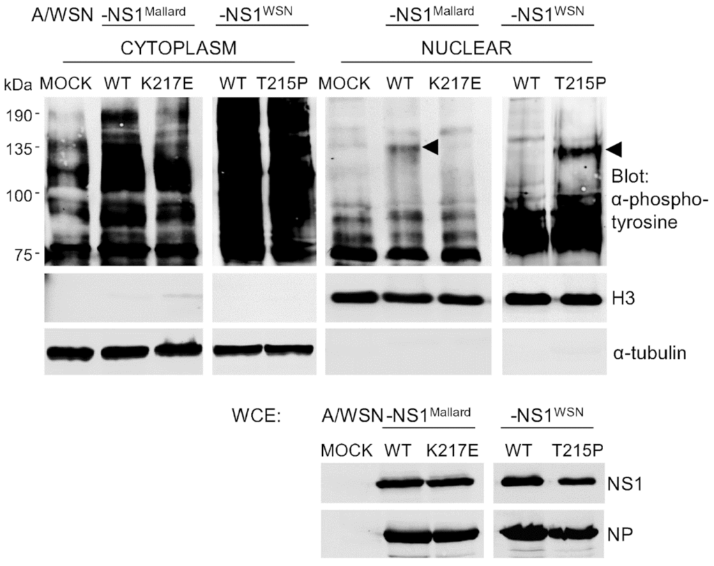 Crk proteins interact with many tyrosine phosphorylated proteins as well as tyrosine kinases [], and upon the original discovery of the viral Crk oncogene (v-Crk) an increase in cellular protein tyrosine phosphorylation was described as a hallmark of Crk-mediated malignant transformation []. To study whether NS1-mediated nuclear translocation of Crk proteins in IAV-infected cells would lead to any functional consequences, we compared the patterns of protein tyrosine phosphorylation in nuclear extracts of A549 cells that were mock-infected or infected for 24 h with IAV expressing NS1 proteins either capable (A/WSN-NS1Mallard(wt) and A/WSN-NS1WSN(T215P)) or not capable (A/WSN-NS1WSN(wt) and A/WSN-NS1Mallard(K217E)) for binding and nuclear targeting of Crk. To enhance the accumulation of phosphotyrosine-modified proteins, the cells were treated for 10 min with the phosphotyrosine phosphatase-inhibitor pervanadate before they were fractionated into nuclear and cytoplasmic extracts that were subjected to Western blotting with an anti-phosphotyrosine (anti-pTyr) antibody (Figure 5). Successful subcellular fractionation was confirmed by probing with antibodies against prototypic nuclear and cytoplasmic proteins, and uniform infection of the cells was demonstrated by probing unfractionated lysates of these cells with antibodies against IAV NS1 and NP. While the nuclear extracts of cells infected with viruses expressing NS1 proteins lacking Crk binding activity did not differ from mock-infected cells in their patterns of tyrosine phosphorylated proteins, a prominent new phosphotyrosine-containing protein with a MW of about 135 kDa appeared in the nuclear extracts of cells infected with A/WSN-NS1Mallard(wt) or A/WSN-NS1WSN(T215P) (Figure 5, pointed with arrows). Thus, we conclude that Crk proteins translocated into the nucleus upon IAV infection via their binding to NS1 can reprogram cellular signaling pathways in the nucleus as evidenced by altered nuclear protein tyrosine phosphorylation.