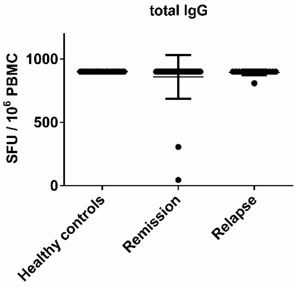 PBMC were isolated from the blood by Ficoll-Paque (GE Healthcare Europe GmbH, Freiburg, Germany) density gradient centrifugation. For polyclonal stimulation of B cells, PBMC were cultured for 96 h prior to the ELISPOT assay at a concentration of 3 × 106 cells/mL in complete Roswell Park Memorial Institute (RPMI)-1640 medium (Lonza, Cologne, Germany) that was supplemented with R-848 at 2.5 μg/mL (Enzo Life Sciences, Inc., Farmingdale, NY, USA), interleukin (IL)-2 at 15 ng/mL (Peprotech, Hamburg, Germany) and 1 μmol β-mercaptoethanol (Sigma, Schnelldorf, Germany). Polyclonal stimulation with R-848 and IL-2 has previously been shown to be a simple method for the selective activation of memory B cells [15]. Complete RPMI medium consisted of RPMI-1640 containing 10% fetal bovine serum (FBS) (Biochrom, Berlin, Germany), 1% L-glutamine (Sigma) and 1% penicillin/streptomycin (Sigma). The plates were coated overnight with whole normal human brain lysate, which was isolated from fresh frozen tissue (30 μg/mL; Novus Biologicals, Littleton, CO, USA), human CMV grade 2 antigen (100 µg/mL; Microbix Biosystems Inc., Mississauga, ON, Canada) or prolyl 3-hydroxylase 3 (P3H3) cell extract EBV antigen (50 µg/mL; Microbix Biosystems Inc., Mississauga, ON, Canada). Coating with anti-human Igκ at 10 μg/mL (SouthernBiotech, Birmingham, AL, USA) served as a positive control. Plates were blocked with 10% FBS in sterile phosphate-buffered saline (PBS) at room temperature for 2 h. Each sample was plated in duplicates with one million polyclonally stimulated PBMC per well for human brain lysate and CMV and 500,000 polyclonally stimulated PBMC per well for EBV, which we found to be the optimal cell concentration in titration experiments. Biotinylated anti-human immunoglobulin (Ig)G (Hybridoma Reagent Laboratory, Baltimore, MD, USA) diluted in 1% bovine serum albumin (BSA) solution was used as a detection antibody at 0.2 μg/mL. Figure 1 shows that the total IgG production as measured by ELISPOT was comparable between all individuals included in the study. Therefore, we assume that the number of plated antibody secreting cells was similar in each donor. All plates were developed with Vector Blue substrate (Vector Laboratories, Burlingame, CA, USA). Spots were counted on an ImmunoSpot® Series 6 Analyzer (Cellular Technology Limited, Shaker Heights, OH, USA).