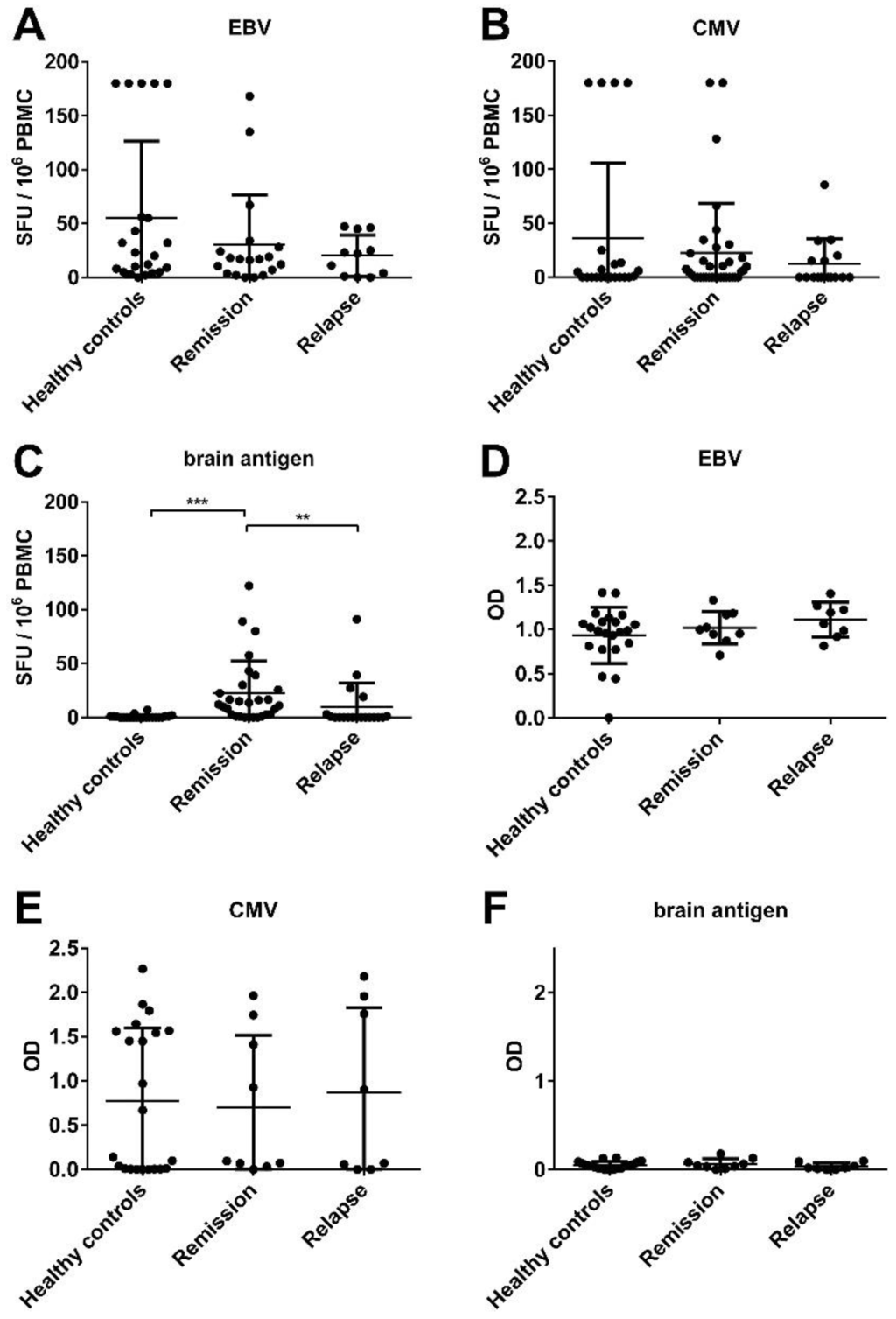 No significant difference in the virus-, but in the brain-specific B cell activity between healthy controls and MS patients. PBMC and plasma were obtained from healthy controls, MS patients experiencing an acute relapse and MS patients in remission. The numbers of Epstein-Barr virus (EBV)- (A); Cytomegalovirus (CMV)- (B) and brain antigen-specific (C) B cells in the polyclonally stimulated PBMC population are shown in addition to the plasma antibody level for EBV (D); CMV (E) and brain antigen (F) for each individual donor in the specified groups. Bars represent median values and standard deviations.