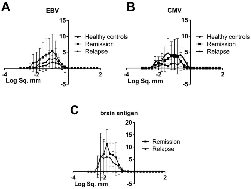 ELISA plates (Thermo Scientific, Schwerte, Germany) were coated overnight with whole normal human brain lysate (10 μg/mL; Novus Biologicals), human CMV grade 2 antigen (10 µg/mL; Microbix Biosystems Inc.), P3H3 cell extract EBV antigen (10 µg/mL; Microbix Biosystems Inc.), active EBV (EA regions) (10 µg/mL; Abcam; Cambridge, UK), EBV nuclear antigen full length protein EBNA1 (10 µg/mL; Abcam), or anti-human Igκ (2.5 μg/mL; SouthernBiotech), respectively, all diluted in PBS or with PBS alone. As for the ELISPOT assay, all antigens were titrated to their optimal concentration for use in the antibody ELISA. Plates were blocked with 10% FBS in PBS containing 0.05% Tween 20 at room temperature for 2 h. The plates were incubated with plasma at 4 °C overnight. All plasma samples were diluted 1:400 in 10% FBS solution containing 0.05% Tween 20 detergent. Biotinylated anti-human IgG (Hybridoma Reagent Laboratory) diluted in 0.5% FBS/0.05% Tween 20 solution was used as a detection antibody at 0.05 μg/mL. All plates were developed with tetramethylbenzidine substrate (eBioscience, Frankurt, Germany) after incubation with streptavidin-horseradish peroxidase (eBioscience) at 1:1000 dilution. The reaction was stopped with 0.16 M sulphuric acid and the optical density (OD) in the wells was read at 450 nm using a Perkin Elmer Victor 3 1420 Multilabel Counter and Wallac 1420 software version 3.00 revision 5.