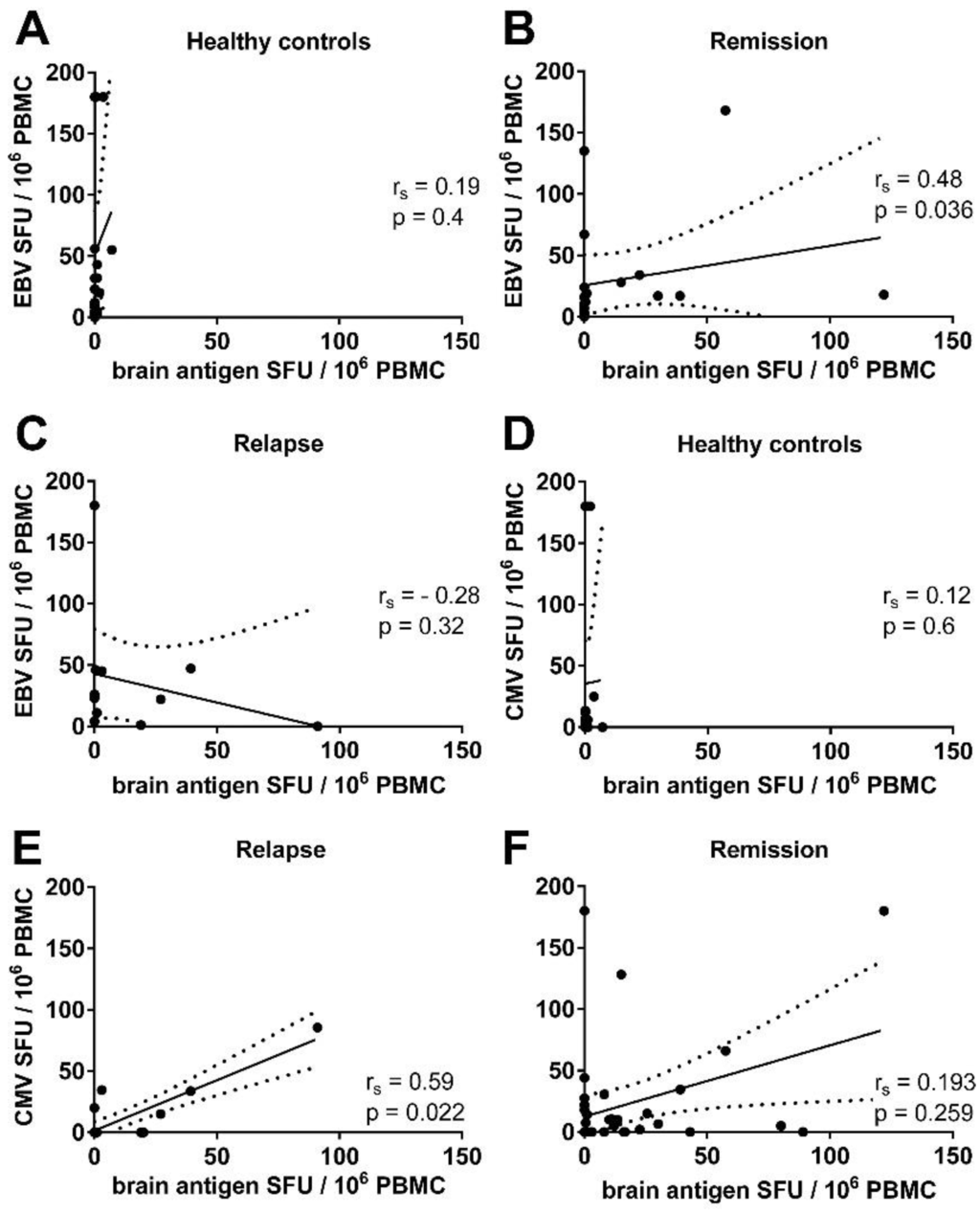 Correlation between the frequencies of virus- and brain antigen-specific B cells in the blood of MS patients. Spearman’s rank correlation (rs) representing the ratio between EBV and brain antigen-specific B cell numbers in the polyclonally stimulated PBMC population of healthy controls (A); MS patients in remission (B) and MS patients experiencing an acute relapse (C); (D–F) Correlation between CMV and brain antigen-specific B cell numbers in healthy controls (D); MS patients in remission (E) and MS patients experiencing an acute relapse (F). Lines represent the linear regression, and dotted lines the 95% confidence interval.