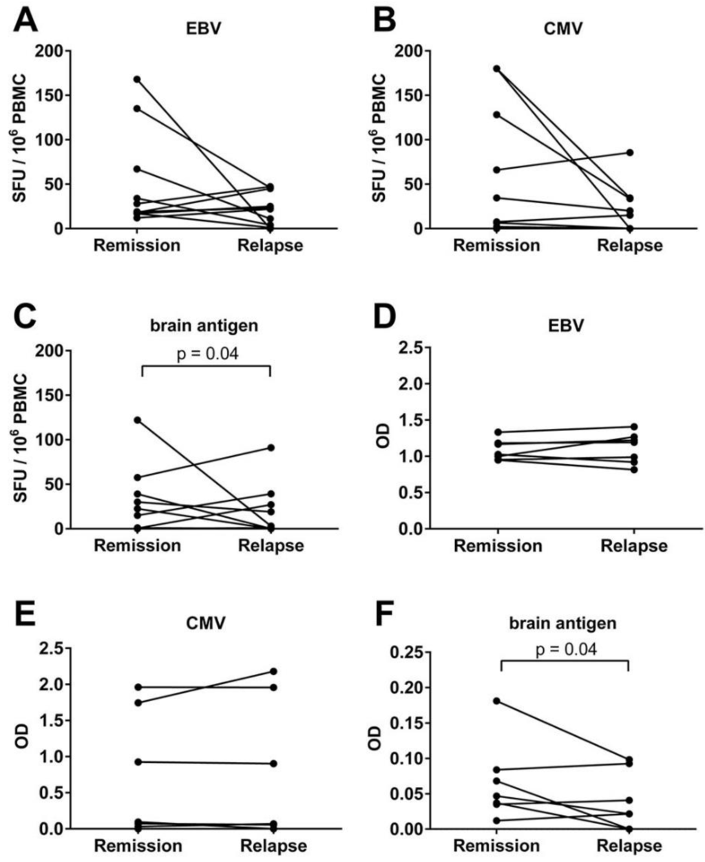 3.4. An Acute MS Relapse Was Not Associated with any Change in the Virus-Specific B Cell Activity, but with a Decrease in Brain-Reactive B Cell Responses Compared to the Remission