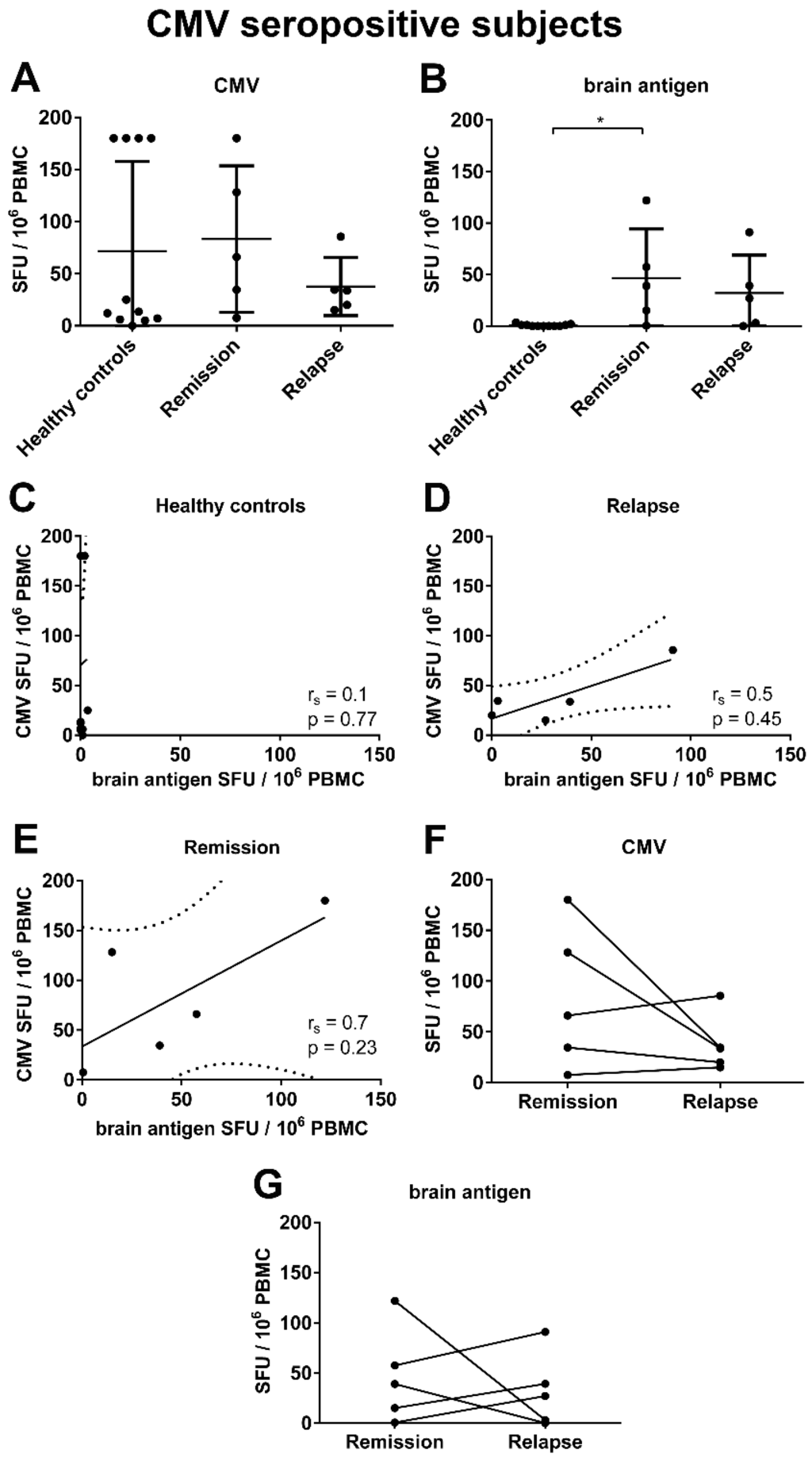 CMV-specific and brain antigen-specific B cell frequencies and correlation analysis with CMV seropositive subjects only. The frequencies of CMV- (A) and brain antigen-specific (B) B cells were determined in n = 11 healthy controls and n = 5 MS patients experiencing a relapse and in the same MS patients in remission for CMV seropositive subjects only. Spearman’s rank correlation (rs) analysis for CMV and brain antigen-specific B cell numbers in healthy controls (C), MS patients experiencing an acute relapse (D) and MS patients in remission (E); lines represent the linear regression, and dotted lines the 95% confidence interval. There was a similar magnitude of the CMV- (F) and brain antigen-specific (G) B cell response in relapse and remission. The results for the individual donors are displayed.