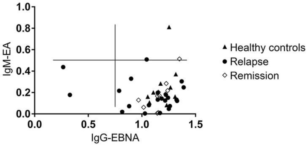 Reactivation of latent EBV infection was defined as the simultaneous seropositivity to IgM directed against EBV early antigen (IgM-EA) and IgG directed against EBV nuclear antigen (IgG-EBNA) [19]. A high IgM-EA titer associated with a high IgG-EBNA titer was evident in one healthy control (IgM-EA OD: 0.80; IgG-EBNA OD: 1.25), in one MS patient experiencing an acute relapse (IgM-EA OD: 0.51; IgG-EBNA OD: 1.0) and in one MS patient in remission (IgM-EA OD: 0.50; IgG-EBNA OD: 1.35). The plasma IgM-EA titers in the other MS patients and healthy controls were below an OD of 0.49. Hence, there was no evidence of EBV reactivation (Figure 7).
