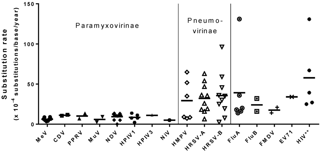 Reported substitution rates for selected viruses with RNA genomes. Each point represents a reported estimate of the substitution rate for the indicated virus. Estimates include measurements made from one or more gene sequences (N, F or H/HN/G genes) and/or the entire genome sequence. Horizontal bars indicate the mean for each virus. ** Human immunodeficiency virus (HIV) is a retrovirus and is included in this figure for comparison.