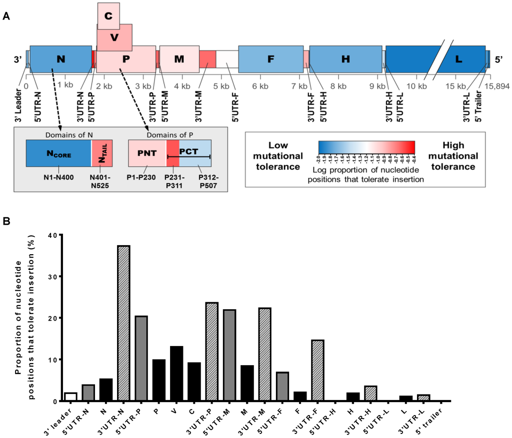 Tolerance for insertional mutagenesis in different regions of the MeV genome. The number of positions that tolerate transposon-mediated insertional mutagenesis in each region of the genome were normalized to the length of the region to determine insertional tolerance. (A) Schematic representation of the MeV genome organization, with each region colored according to its mutational tolerance. UTR = untranslated region. Grey inset box shows the mutational tolerance of different domains within N and P, with residue numbers indicated below each respective domain; PNT = N-terminal domain of P; PCT = C-terminal domain of P; (B) Quantification of tolerance for insertional mutation in different genomic regions. Data obtained from Fulton et al. (2015) [].